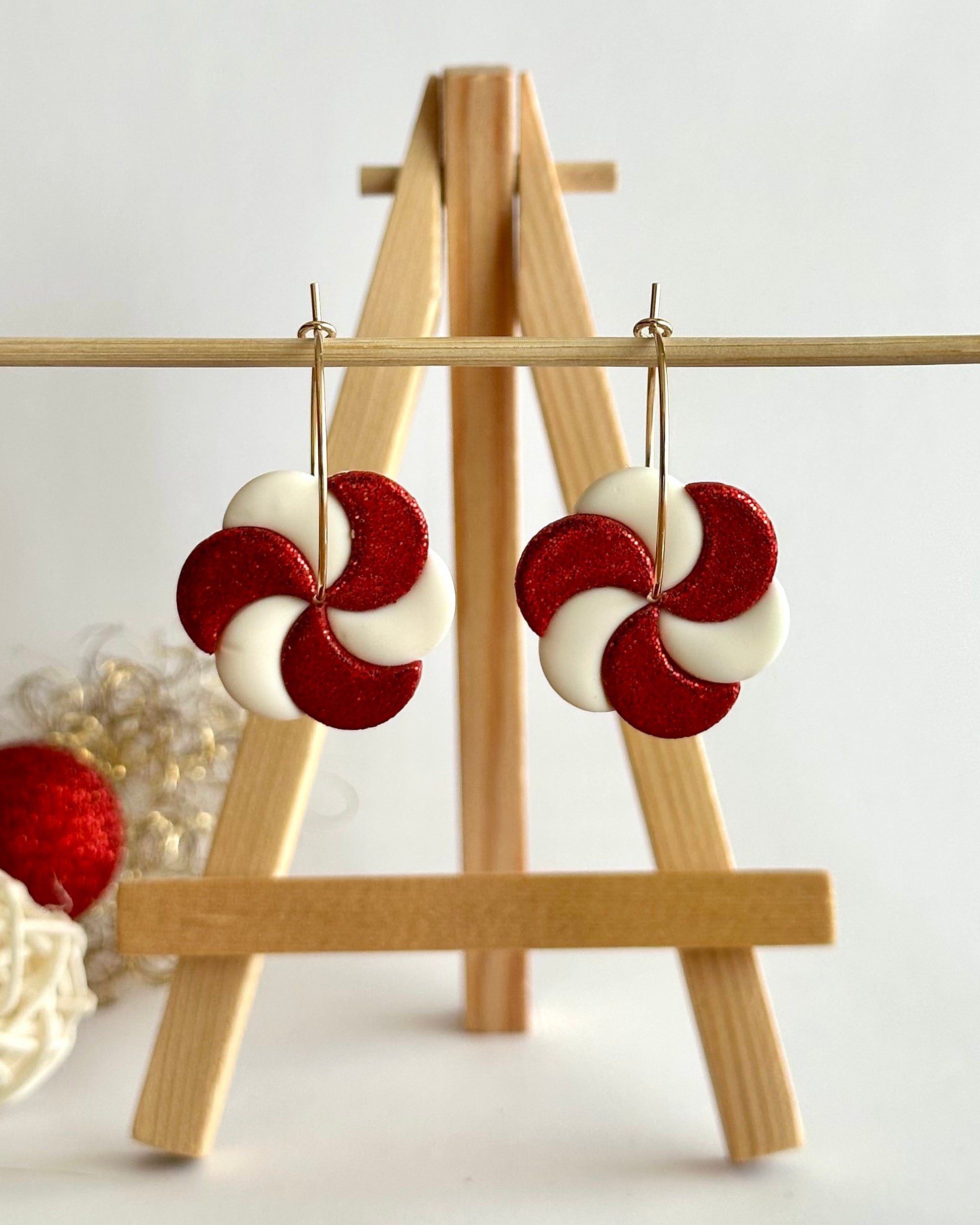 Diese weihnachtlichen Creolen mit Anhänger wirken am Ohr sehr verspielt. Die dünne Creole hat einen Durchmesser von 2.5 cm und trägt einen rot-weiss glitzernden Bonbonanhänger, der sich sehr schön dreht und einen tollen Effekt erzielt.