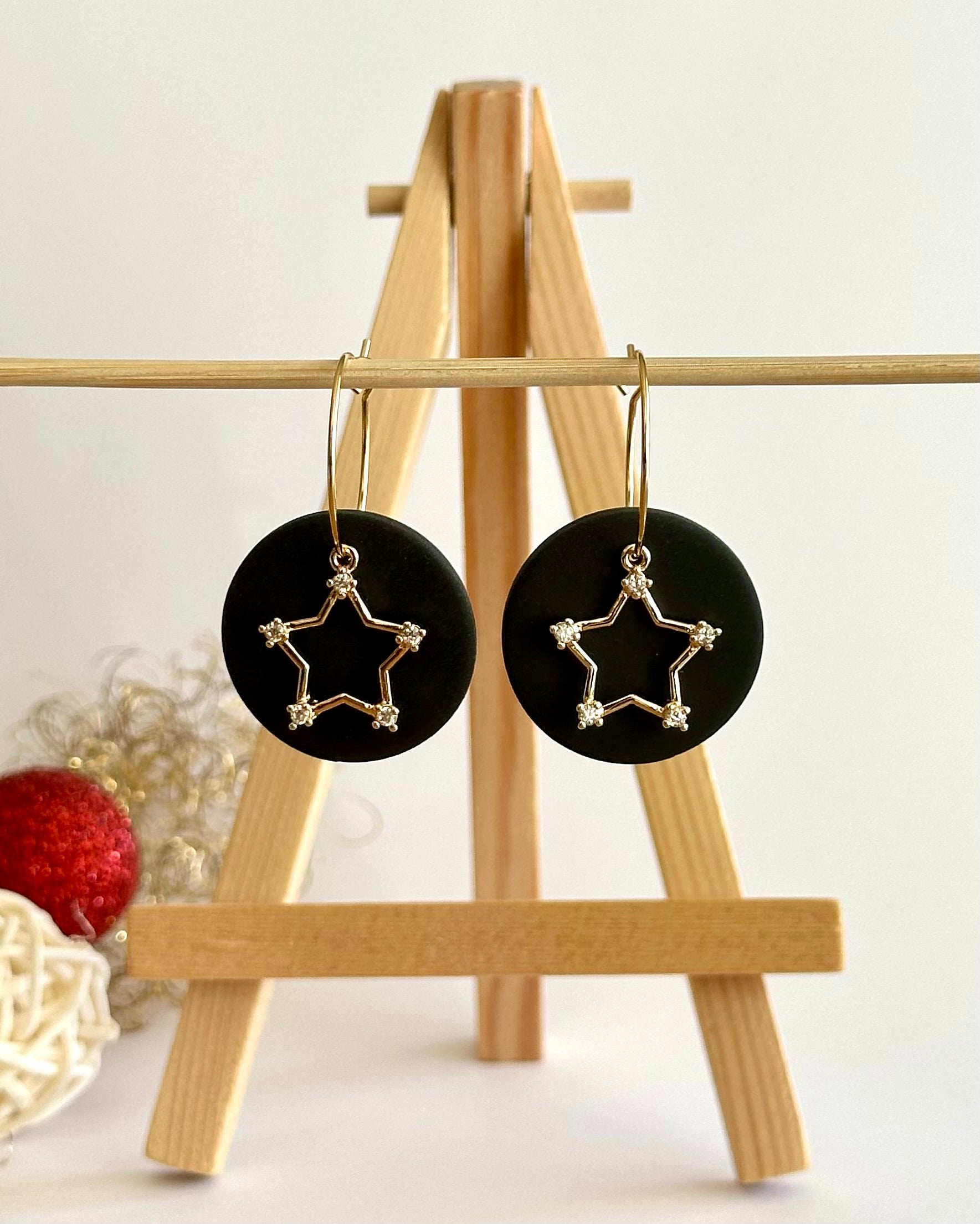 Diese weihnachtlichen Creolen mit Anhänger wirken am Ohr sehr elegant. Die dünne Creole hat einen Durchmesser von 2.0 cm und trägt einen runden schwarzen Kreis, vor dem ein kleiner goldfarbener Stern hängt. Das Besondere an diesen Ohrringen ist, dass man den Stern nach Weihnachten von der Creole abnehmen und sie weiterhin als neutralen Ohrhänger tragen kann.