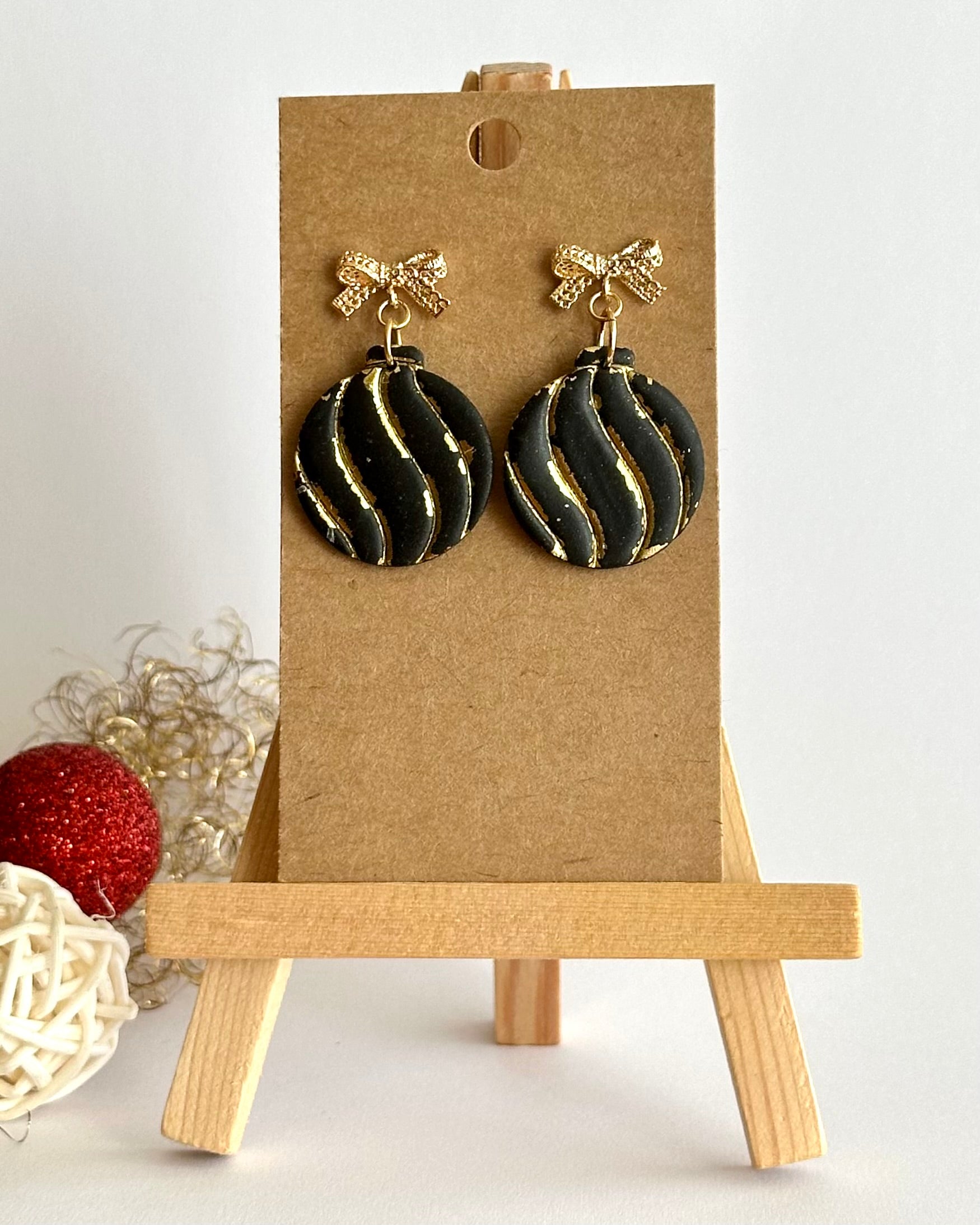 Diese elegante Weihnachtskugel besticht durch ihre goldfarbenen Details: zum einen den kleinen Schleifenstecker und zum anderen die einzigartigen Blattgolddetails auf dem Anhänger. Diese Ohrringe sind der perfekte Begleiter unter dem Weihnachtsbaum.