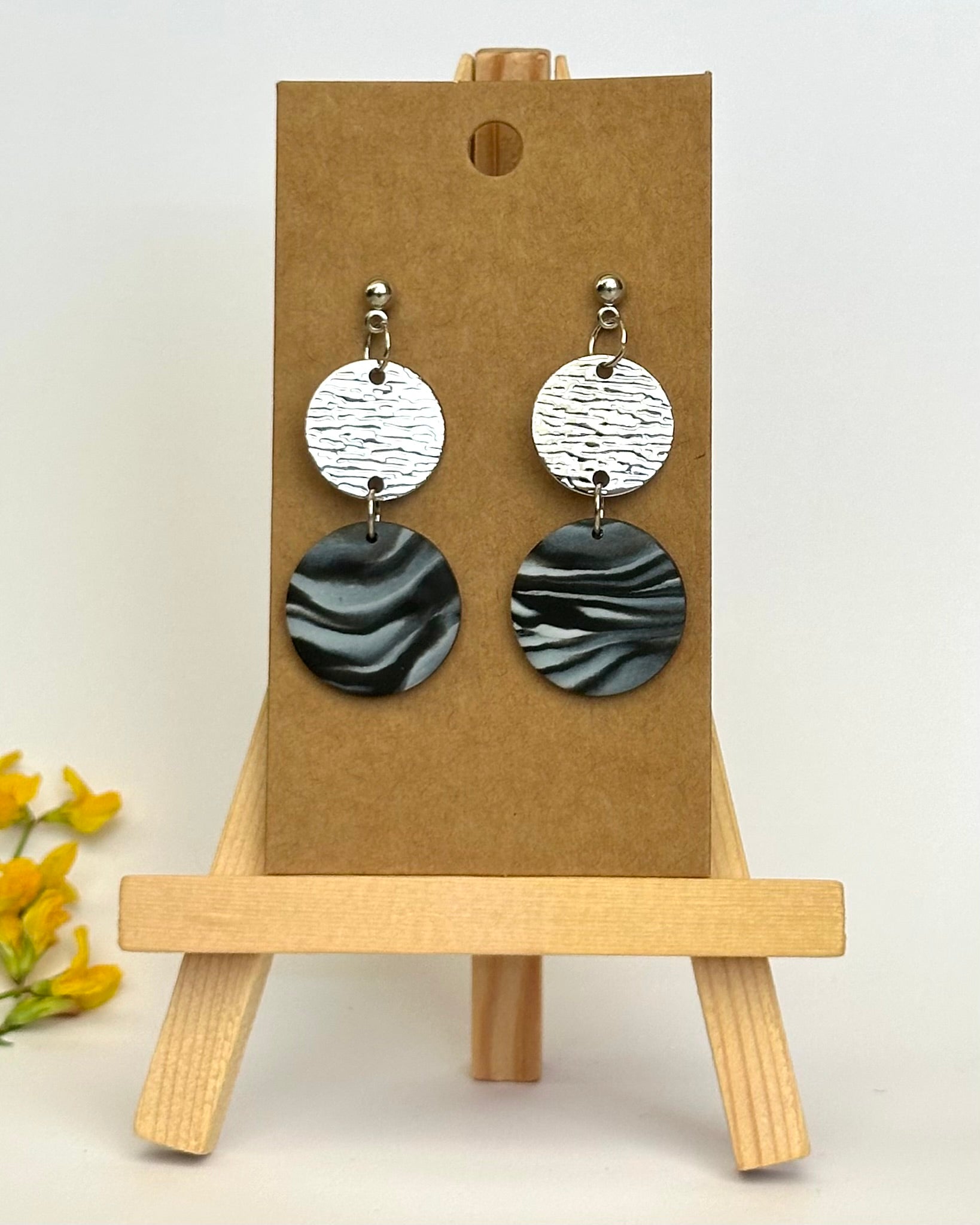 Diese Ohrhänger aus zwei runden Elementen bestechen durch ihr wellenförmiges Muster aus schwarz und weiss. Ein besonderer Hingucker ist das runde silberfarbene Element.