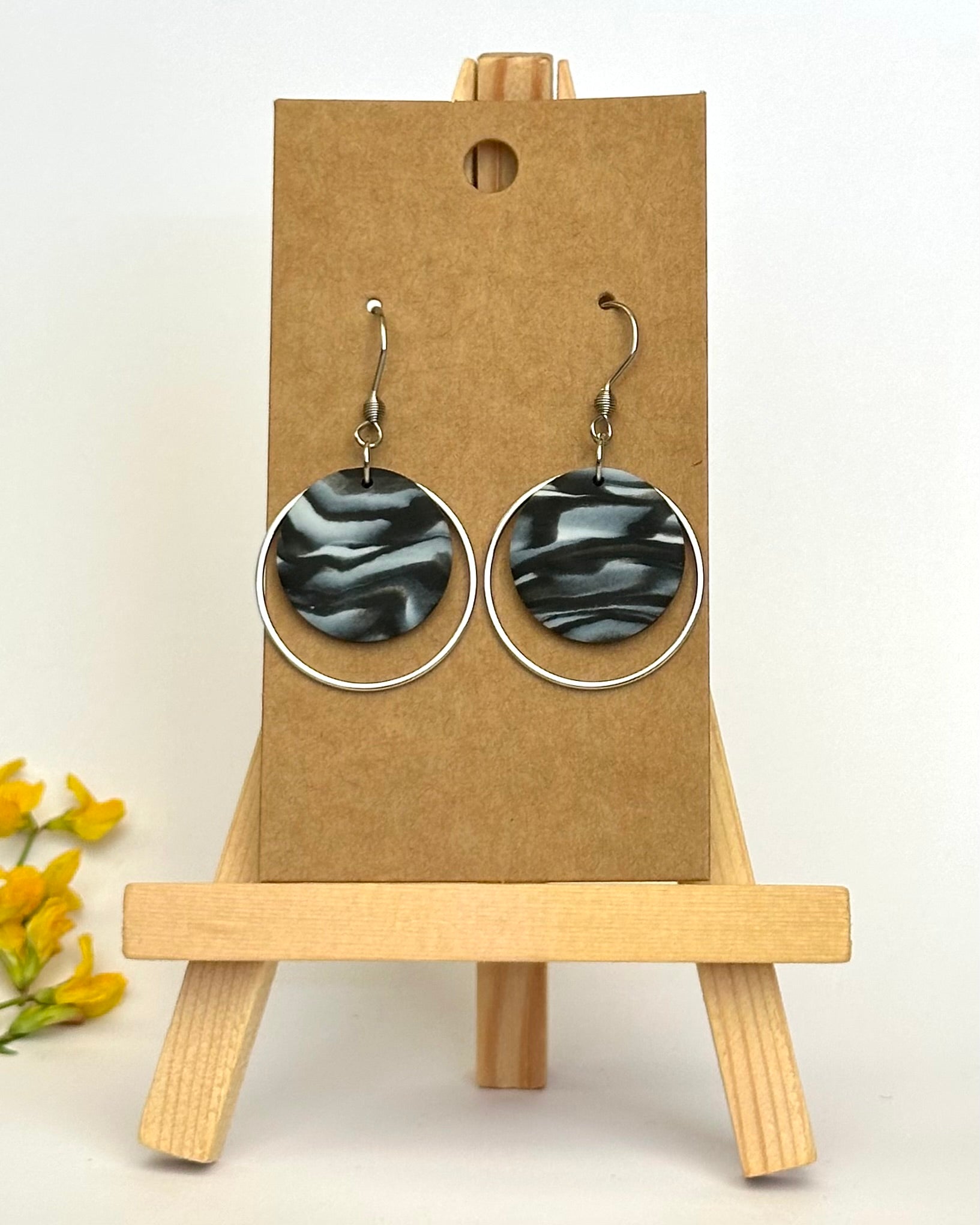 Diese runden Ohrhänger bestechen durch ihr wellenförmiges Muster aus schwarz und weiss. Ein besonderer Hingucker ist das runde silberfarbene Element.