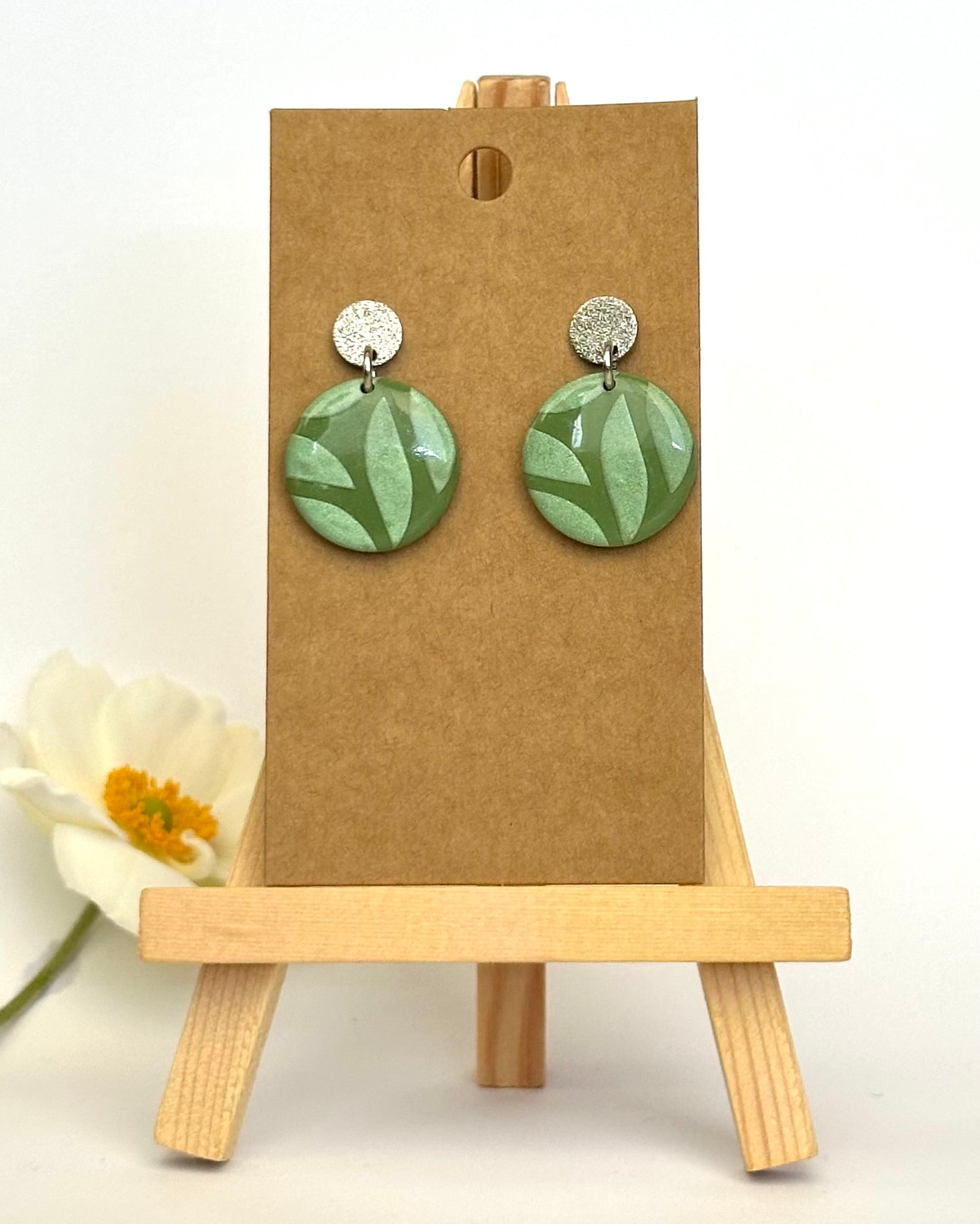 Diese stilvollen Ohrhänger sind mit einem grünen Anhänger gestaltet, der mit einem schillernden Ornamentmuster verziert ist - eine Verbindung von Frische und Eleganz.