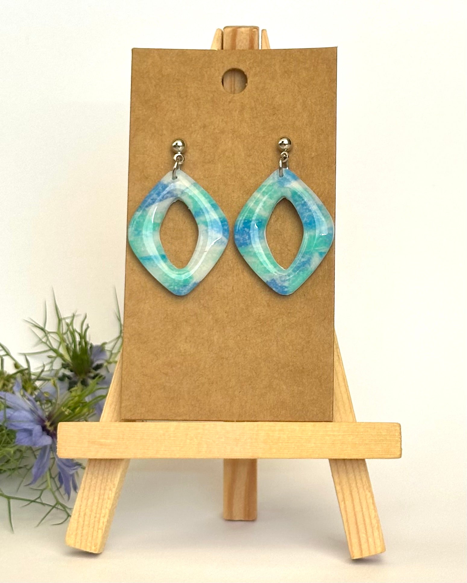 Diese eleganten Ohrhänger überzeugen durch ihre einzigartige Marmor-Optik in Blau-, Grün- und Weisstönen. Jedes Teil ist ein Unikat. Vor allem im Sonnenlicht kommt der leicht durchsichtige Effekt besonders zur Geltung.