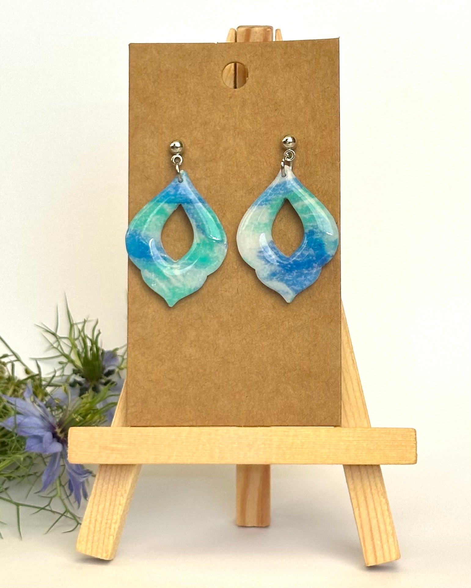 Diese eleganten Ohrhänger überzeugen durch ihre einzigartige Marmor-Optik in Blau-, Grün- und Weisstönen. Jedes Teil ist ein Unikat. Vor allem im Sonnenlicht kommt der leicht durchsichtige Effekt besonders zur Geltung.
