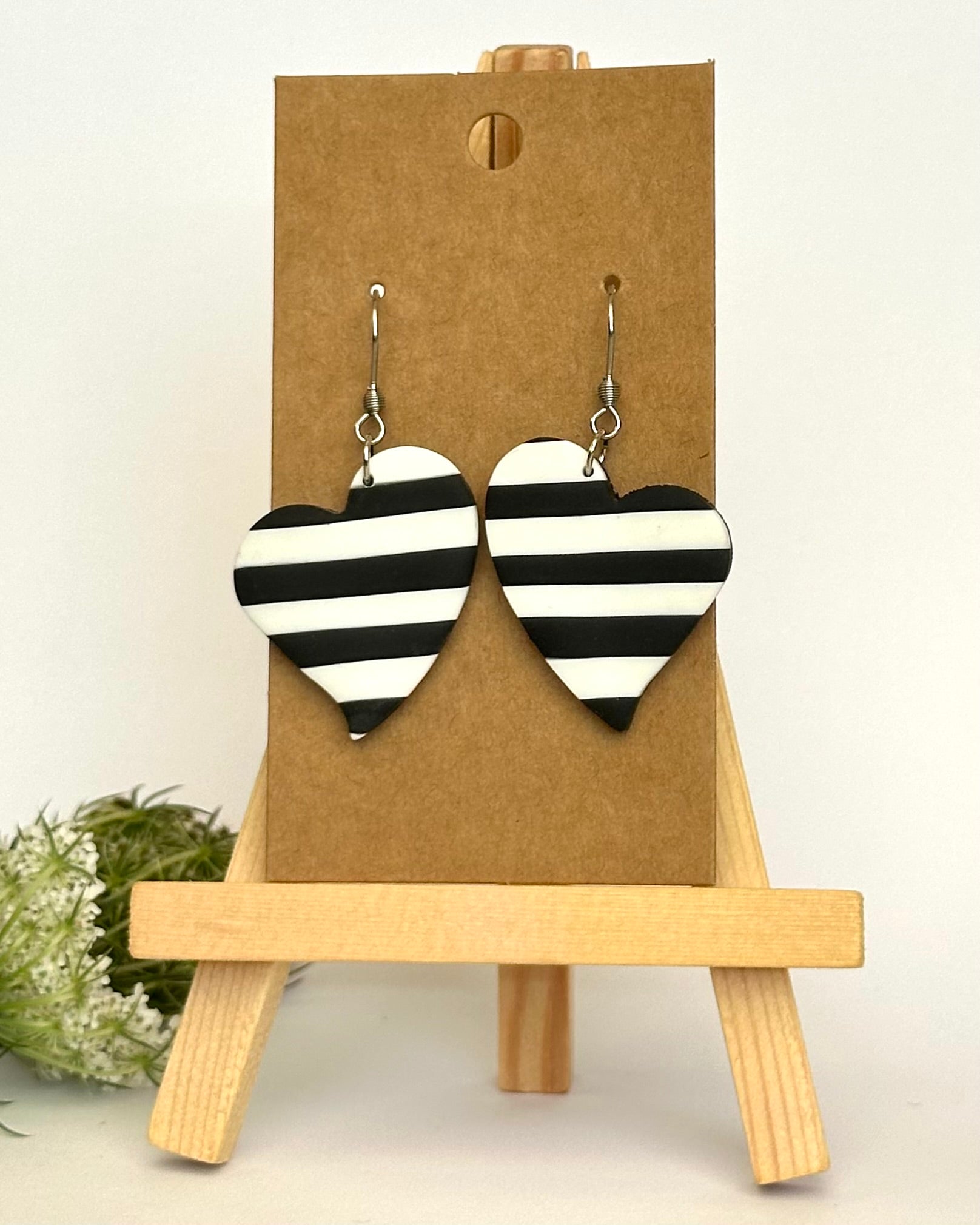 Diese schwarz-weiss gestreiften Ohrhänger in Herzform sind ein Blickfang in deinem Alltag oder auf der nächsten Party. Sie lassen sich super zu schwarzen oder weissen Outfits kombinieren.