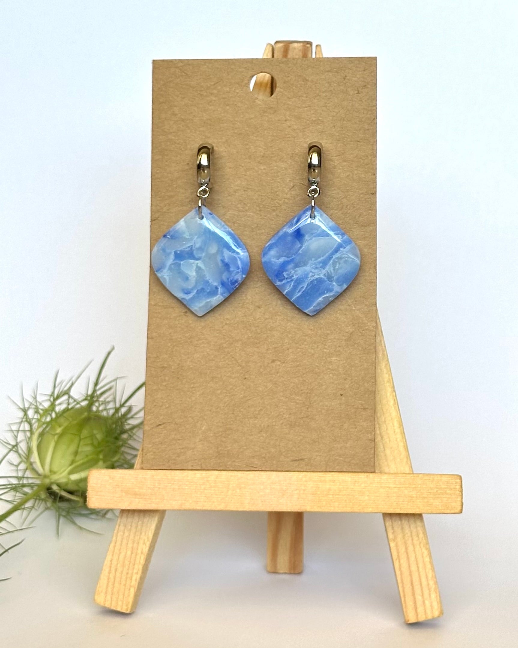 Diese eleganten Ohrhänger überzeugen durch ihre einzigartige Marmor-Optik in Hellblau- und Weisstönen, die jedes Teil zum Unikat machen. Vor allem im Sonnenlicht kommt der leicht durchsichtige Effekt besonders zur Geltung.