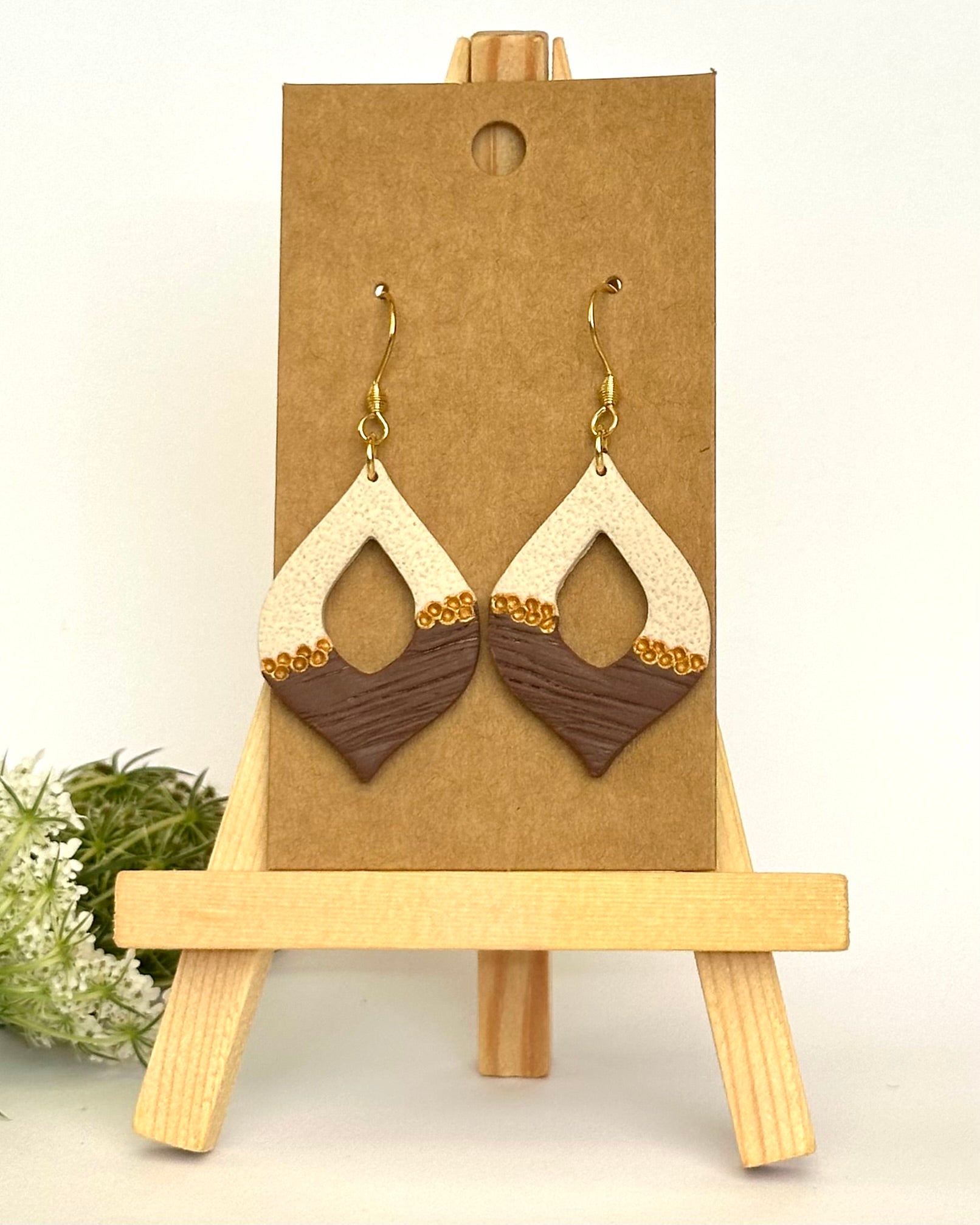 Diese edlen Ohrhänger bestechen durch ihre Kombination aus zwei Farbtönen (beige und dunkelbraun) und zwei Texturen (gekörnt und Holzmaserung). Der besondere Eyecatcher ist die goldfarbene Abgrenzung der zwei Bereiche.
