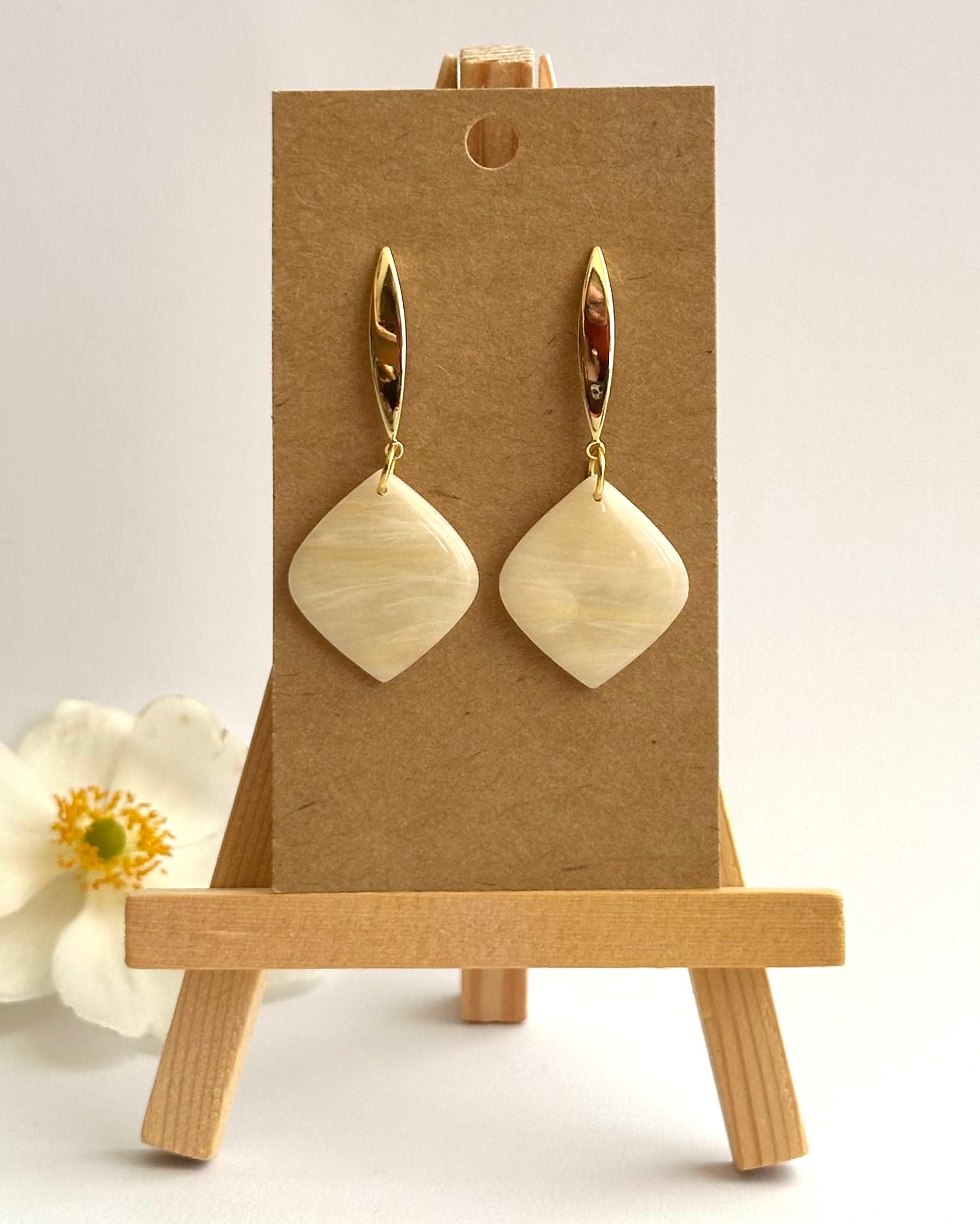 Diese eleganten Ohrhänger überzeugen durch ihre einzigartige Marmor-Optik in Gold- und Weisstönen. Jedes Teil ist ein Unikat. Vor allem im Sonnenlicht kommt der leicht durchsichtige Effekt besonders zur Geltung.