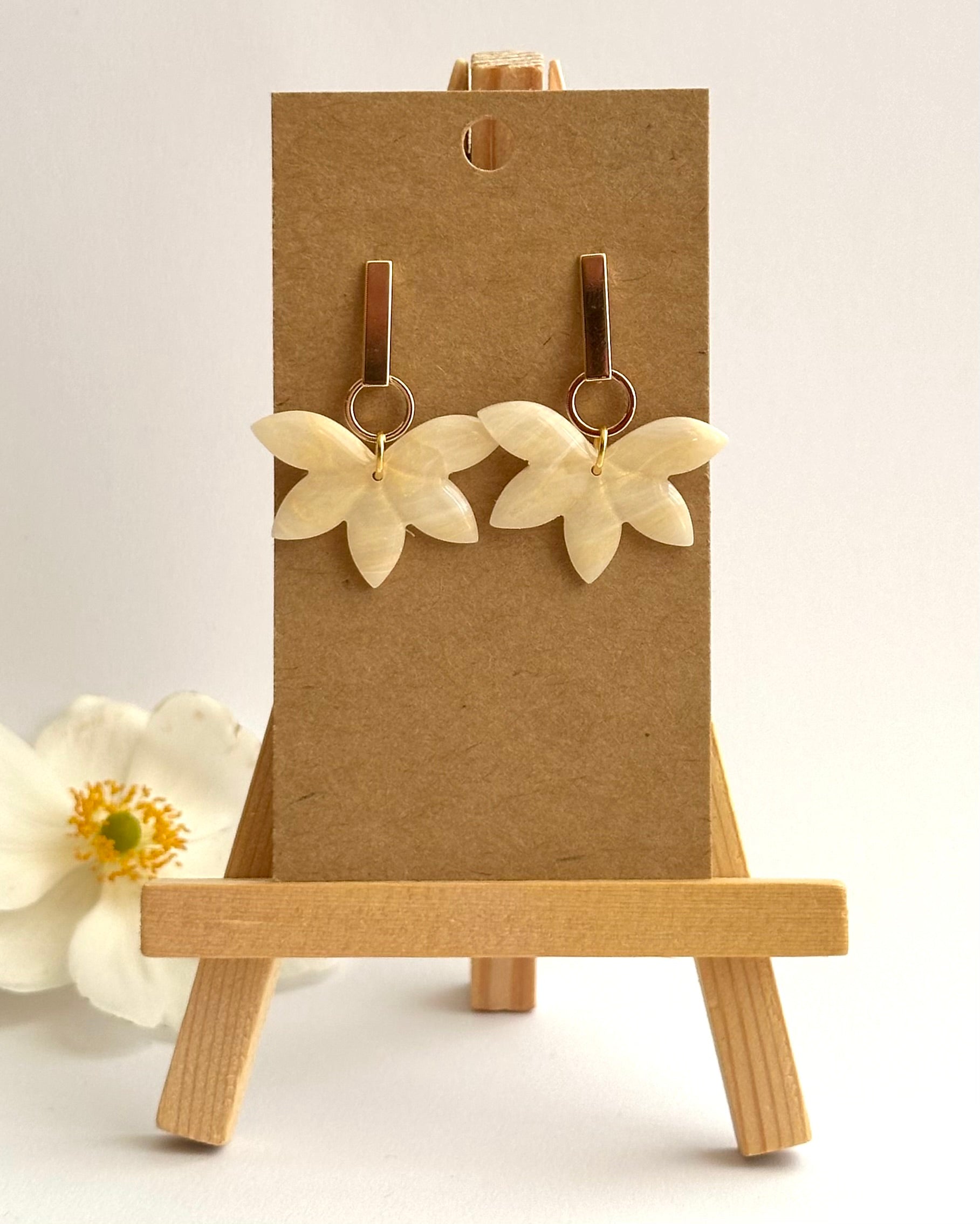 Diese eleganten Ohrhänger überzeugen durch ihre einzigartige Marmor-Optik in Gold- und Weisstönen. Jedes Teil ist ein Unikat. Vor allem im Sonnenlicht kommt der leicht durchsichtige Effekt besonders zur Geltung.