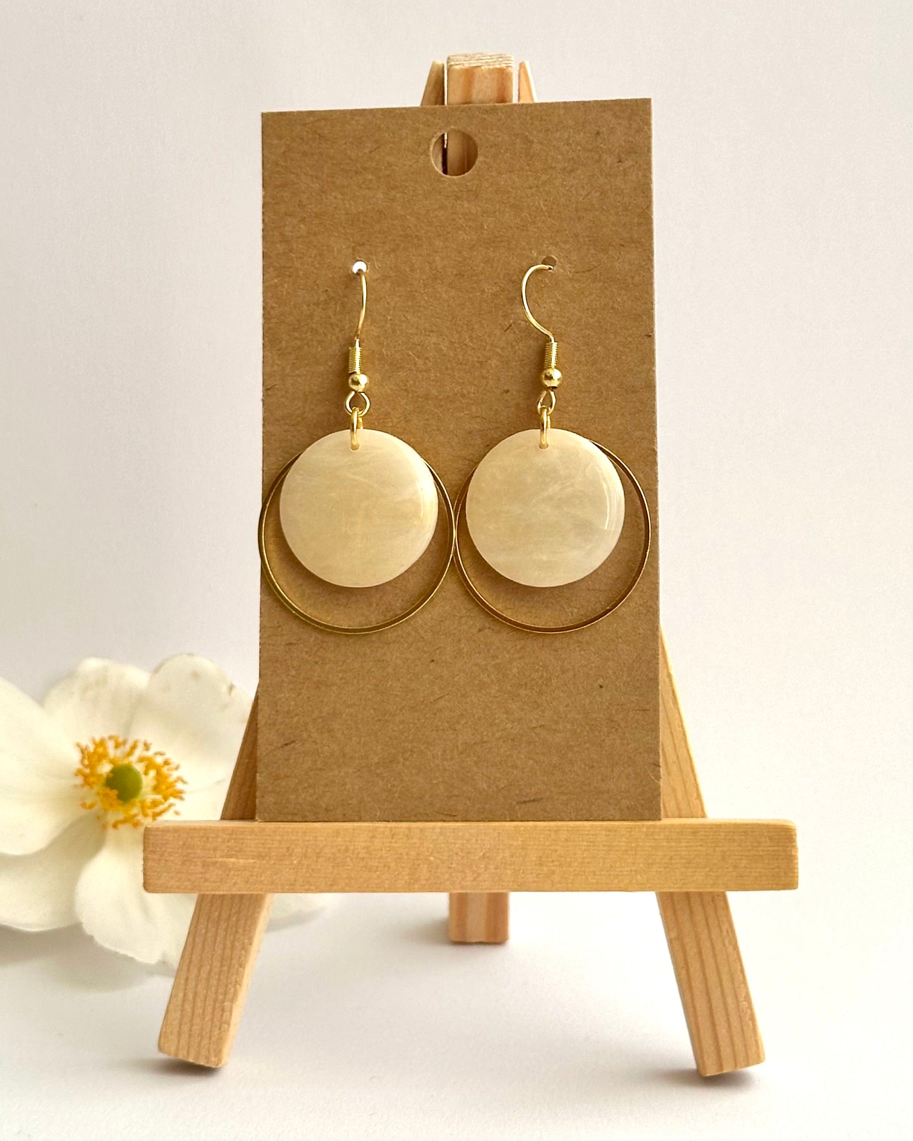 Diese eleganten runden Ohrhänger überzeugen durch ihre einzigartige Marmor-Optik in Gold- und Weisstönen. Jedes Teil ist ein Unikat. Vor allem im Sonnenlicht kommt der leicht durchsichtige Effekt besonders zur Geltung.