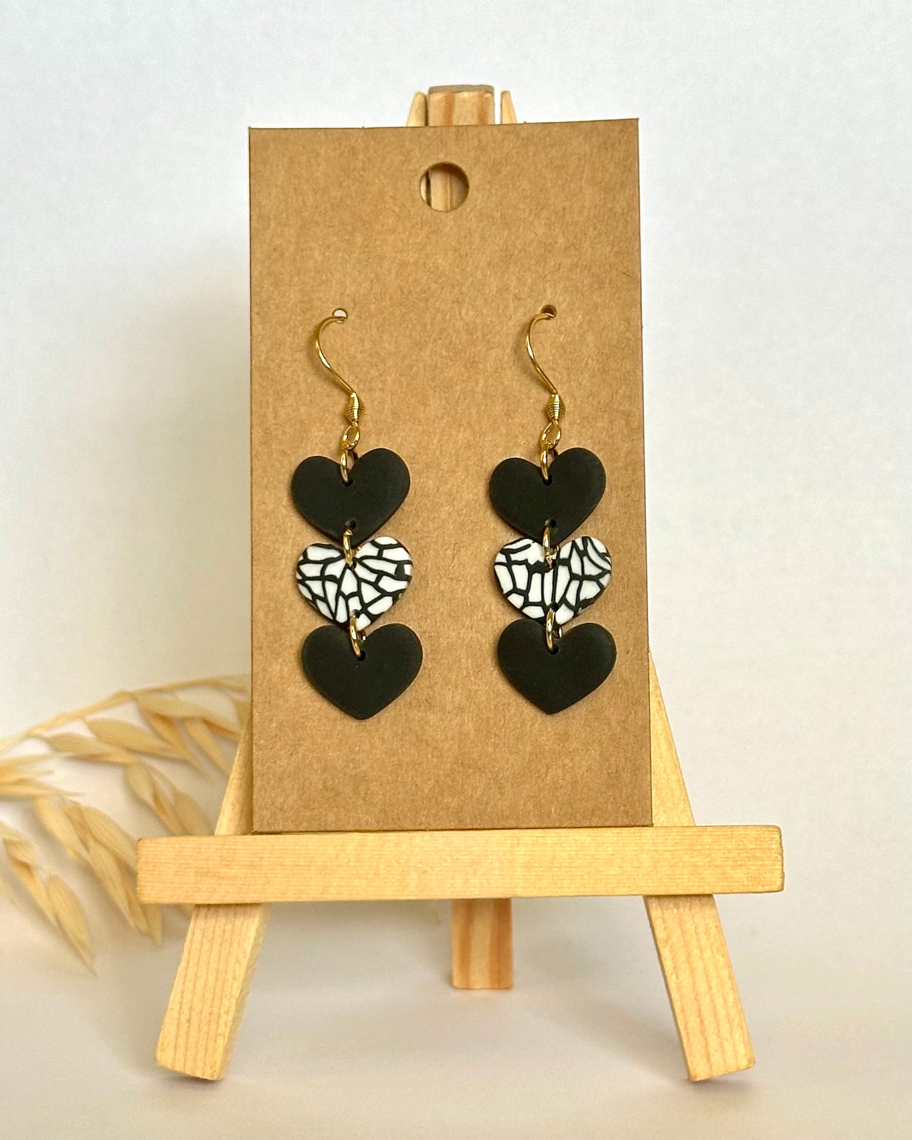 Diese süssen Herzchen-Ohrhänger bestechen durch ihre Kombination aus schwarz und weiss, mit einem besonders filigranen Muster.