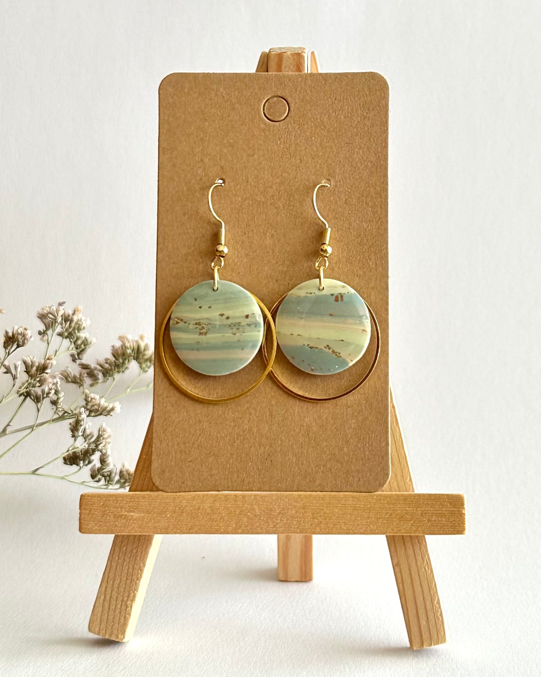 Diese frühlingshaften Ohrringe zeichnen sich durch das pastellfarbene Muster in Blau-, Grün-, Gelb- und Rosatönen sowie das goldfarbene Kreiselement aus. Jedes Teil ist ein Unikat. Ein trendiges Accessoire, das jedem Outfit eine frische Note gibt.