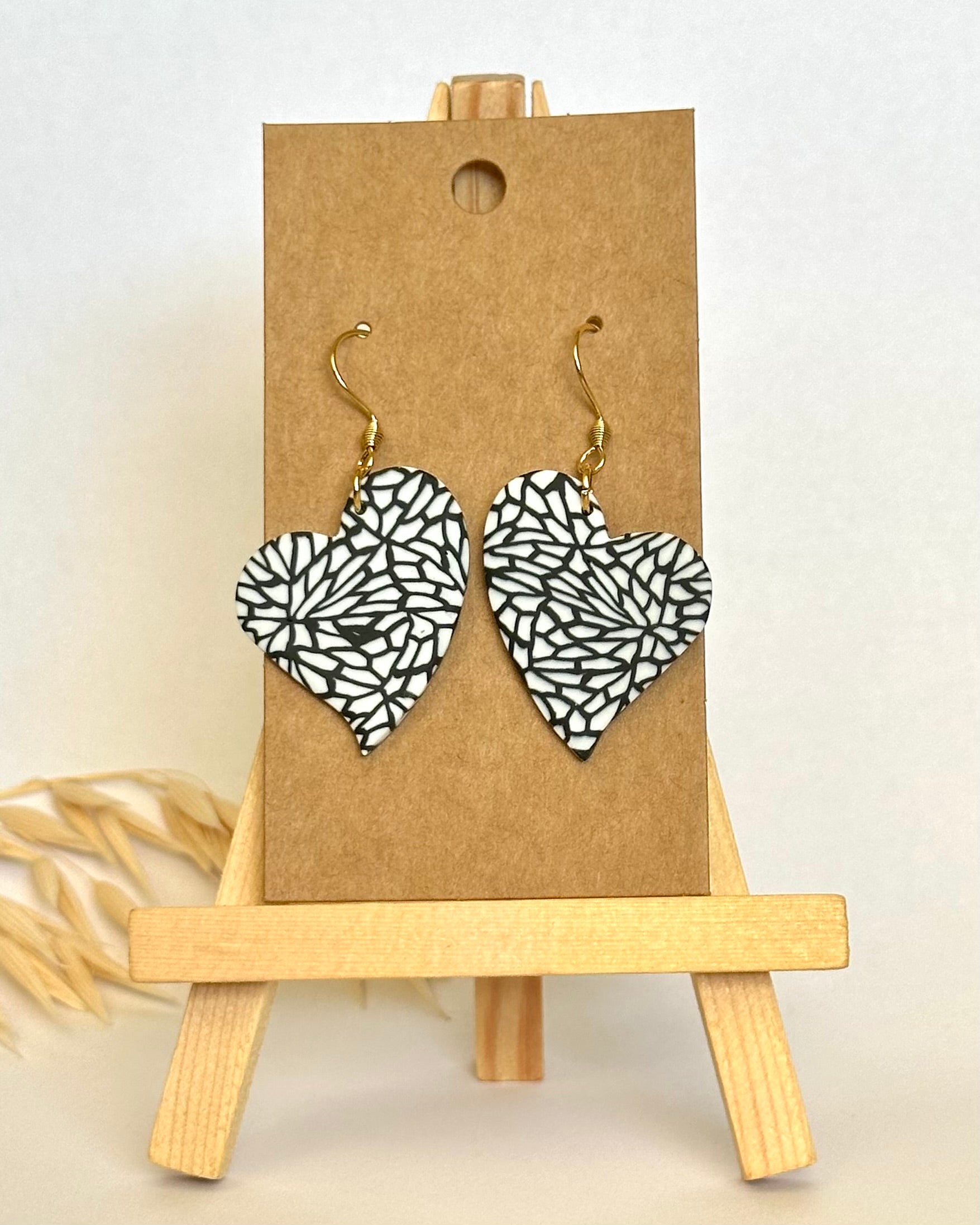 Diese süssen Herz-Ohrhänger bestechen durch ihre Kombination aus schwarz und weiss, mit einem besonders filigranen Muster.