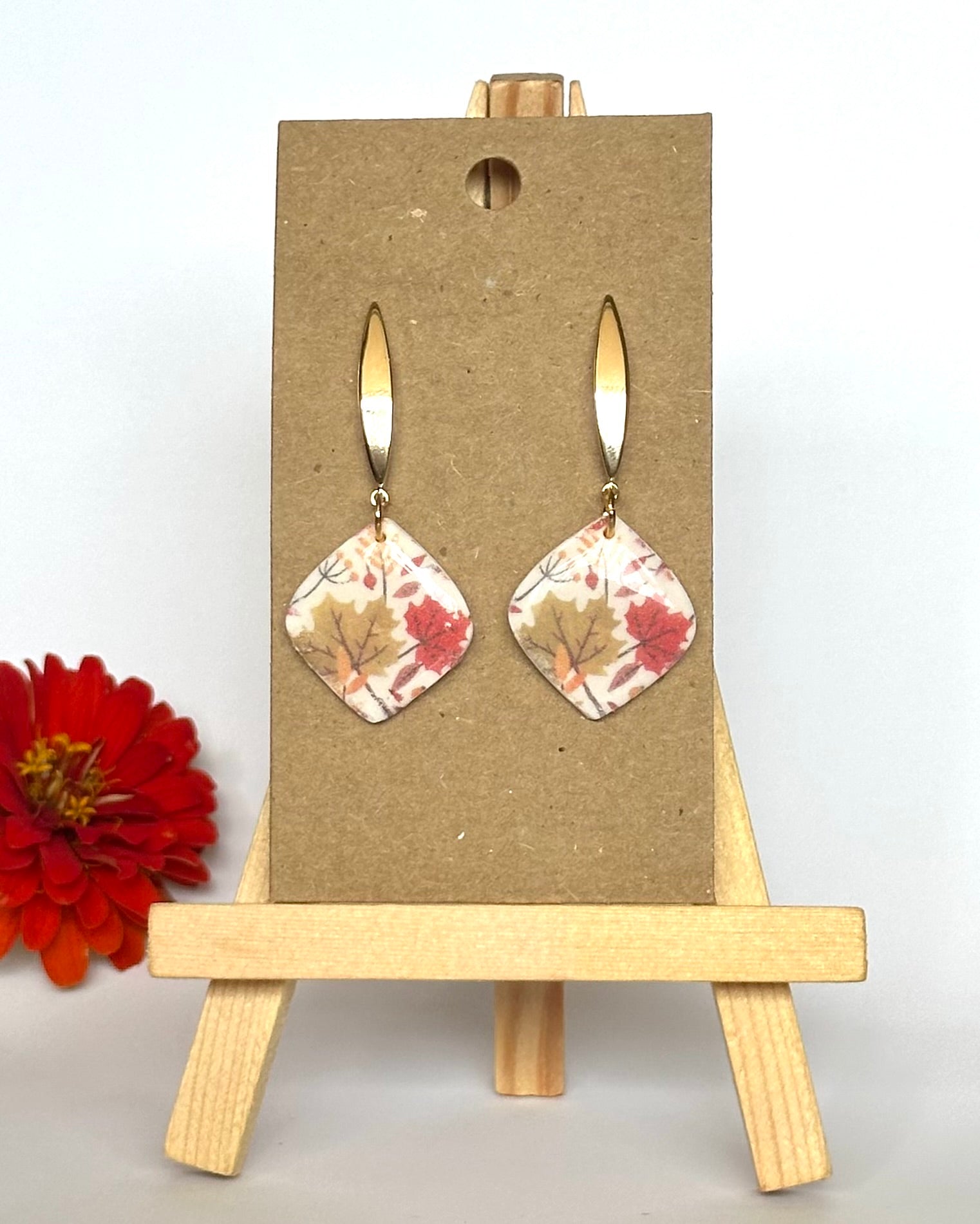 Der Herbst, der Herbst, der Herbst ist da! Diese Ohrhänger mit einem Herbstblättermotiv sind ein absoluter Hingucker. Das Motiv wurde mithilfe von Transferpapier aufgetragen und mit einer glänzenden UV-Harz-Schicht versiegelt.