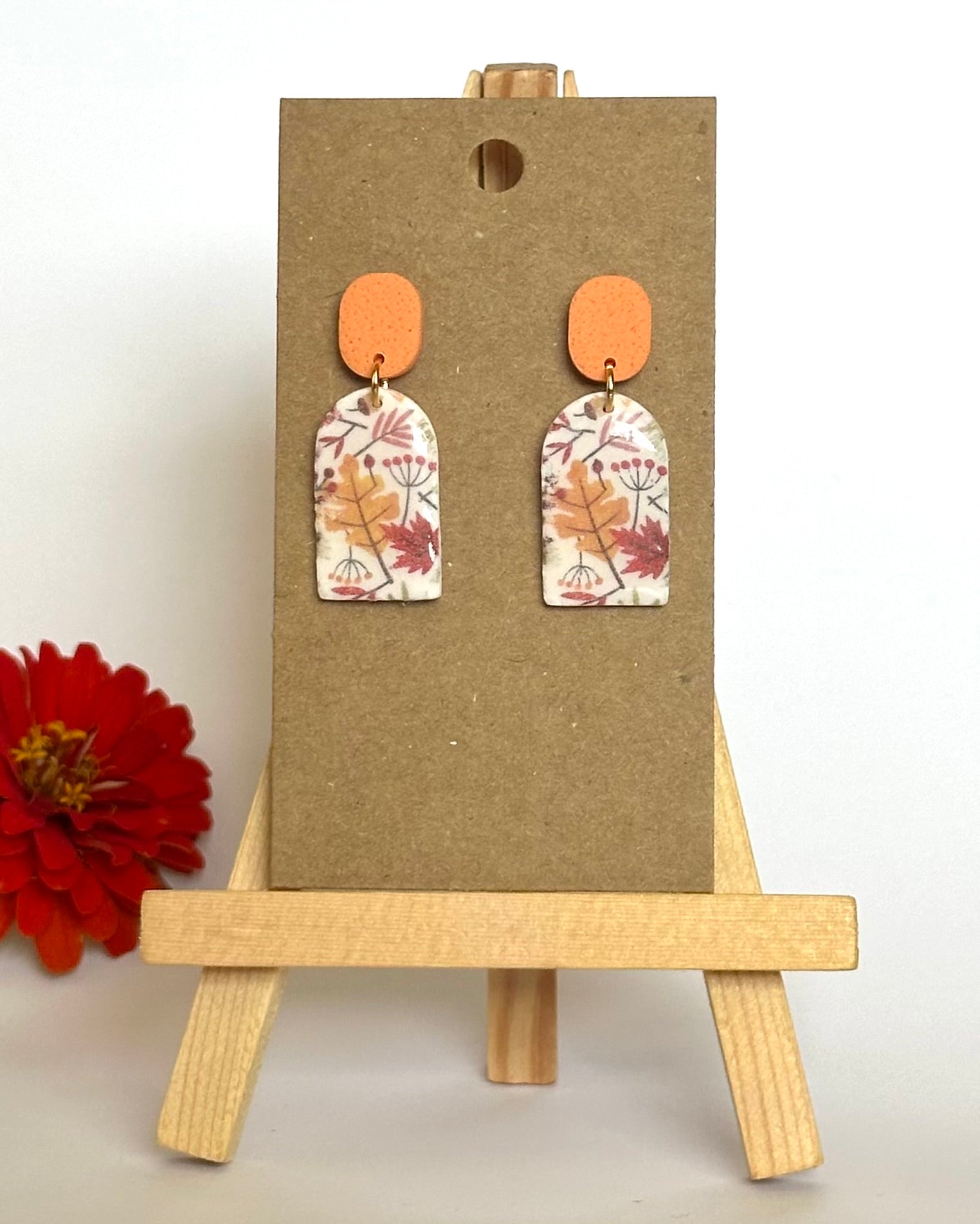 Der Herbst, der Herbst, der Herbst ist da! Diese Ohrhänger mit einem Herbstblättermotiv sind ein absoluter Hingucker. Das Motiv wurde mithilfe von Transferpapier aufgetragen und mit einer glänzenden UV-Harz-Schicht versiegelt.