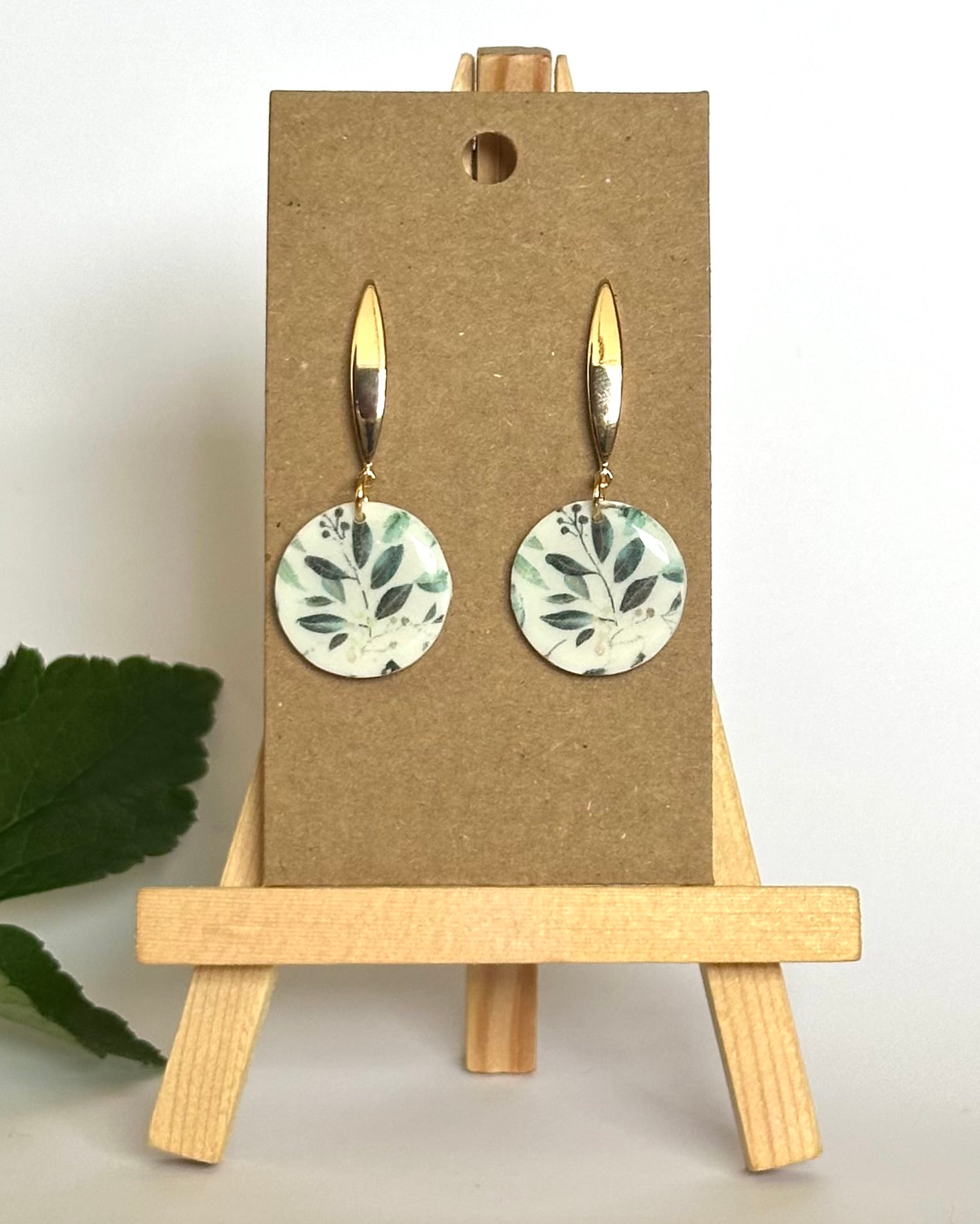 Diese Ohrhänger mit einem Blättermotiv sind ein absoluter Hingucker. Das Motiv wurde mithilfe von Transferpapier aufgetragen und mit einer glänzenden UV-Harz-Schicht versiegelt.