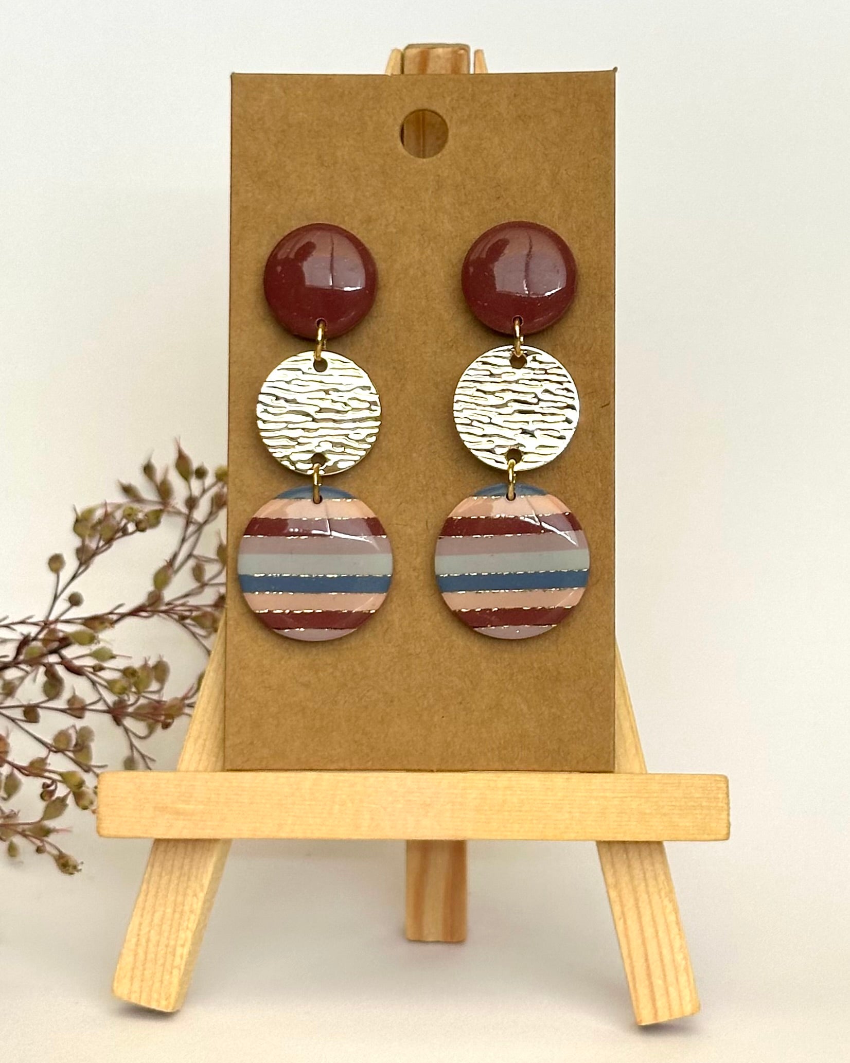 Diese stilvollen Ohrringe kombinieren einen dunkelroten Stecker mit einer goldfarbenen gehämmerten Scheibe und einem runden Anhänger im modernen Streifenmuster in Blau-, Grau- und Rottönen. Ein trendiges Accessoire, das jedem Outfit eine elegante Note gibt.