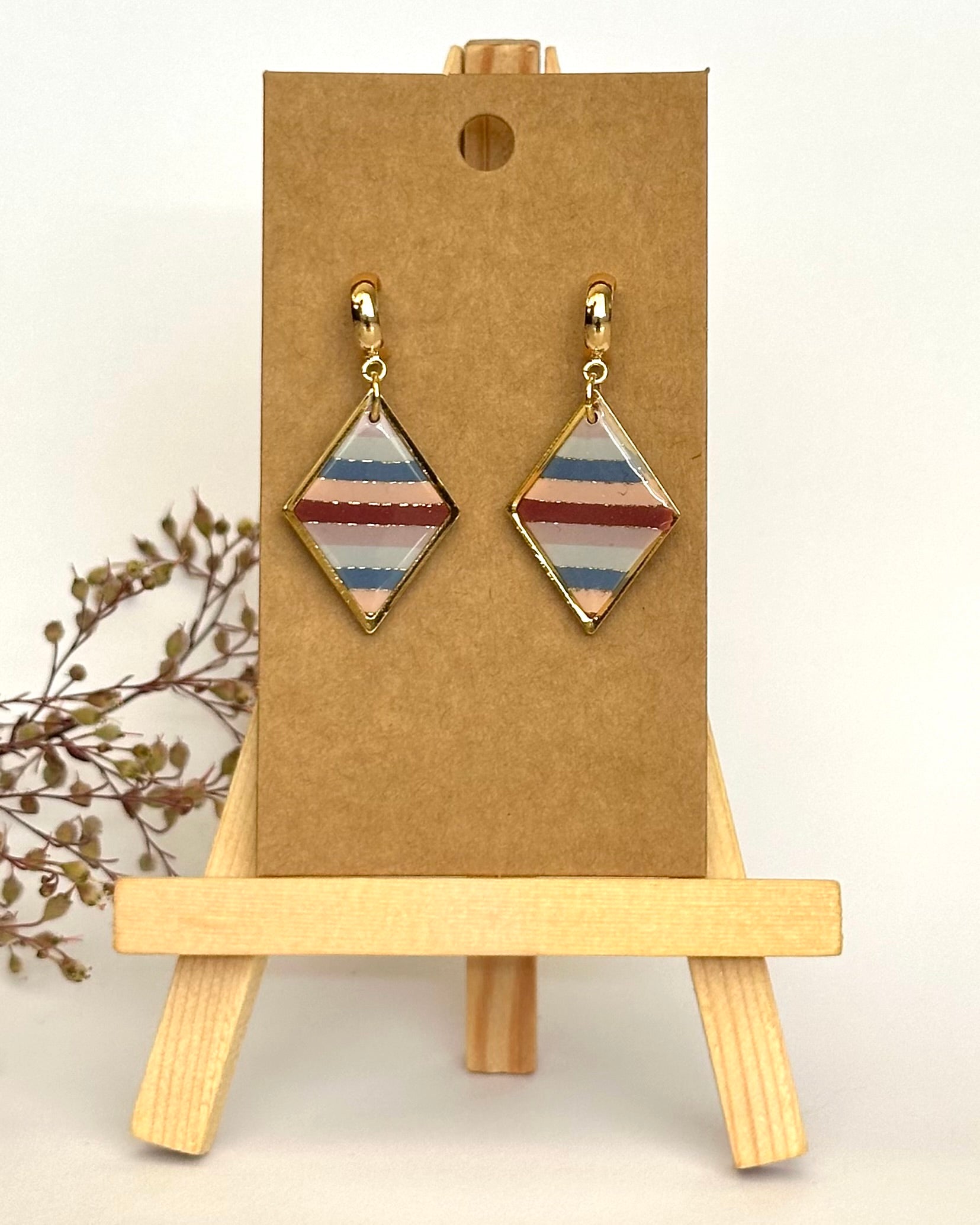 Diese stilvollen Ohrringe zeichnen sich durch das moderne Streifenmuster in Blau-, Grau- und Rottönen aus. Ein trendiges Accessoire, das jedem Outfit eine elegante Note gibt.