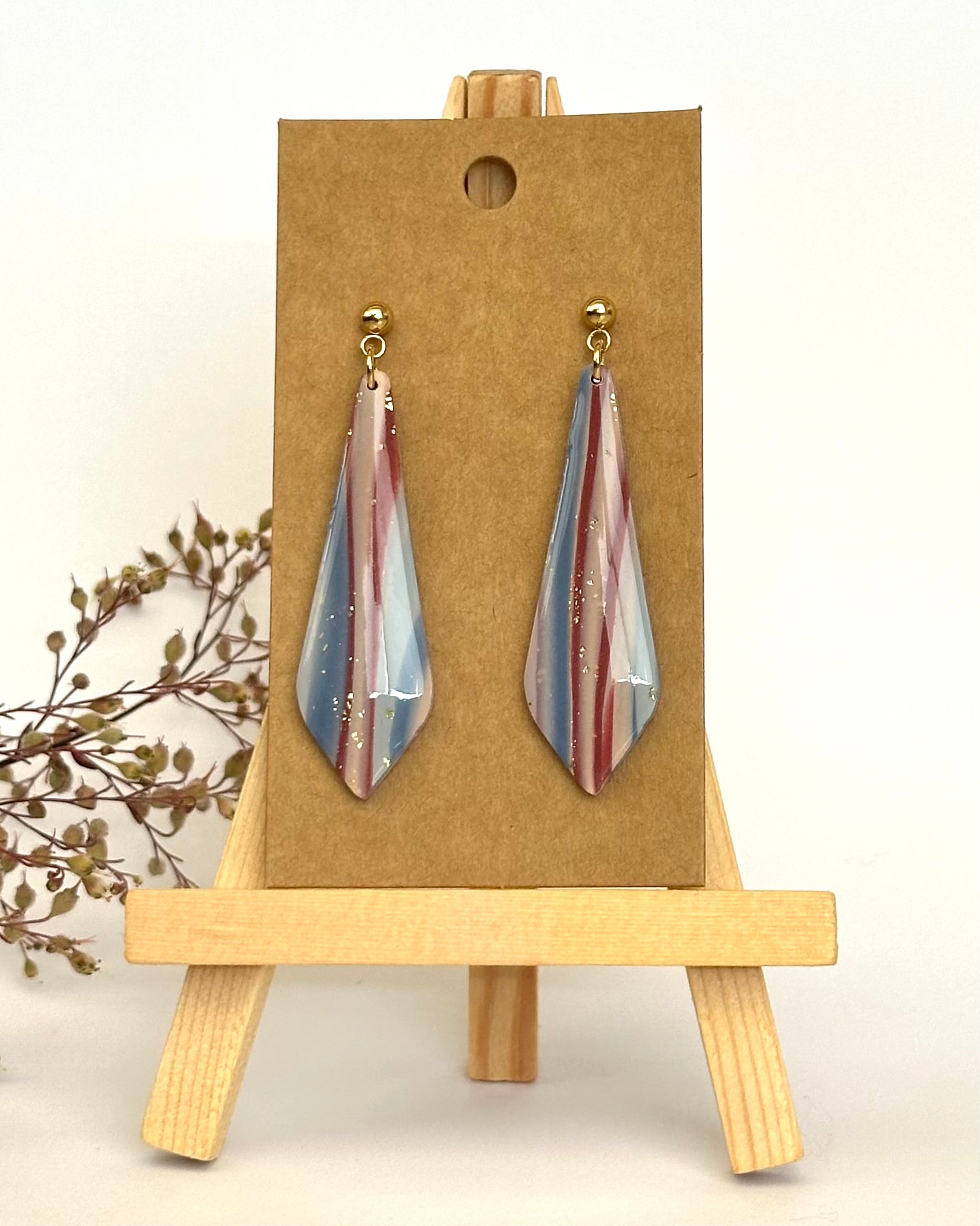Diese eleganten Ohrringe sind mit feinen Streifen in Blau-, Grau- und Rottönen gestaltet und mit goldfarbenen Akzenten veredelt. Ein modernes Design, das Leichtigkeit und Stil vereint.