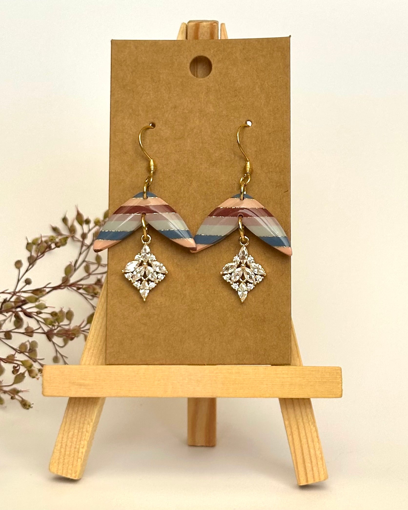 Diese stilvollen Ohrringe zeichnen sich durch die Kombination des modernen Streifenmusters in Blau-, Grau- und Rottönen und einem funkelnden Anhänger in Blattform aus. Ein trendiges Accessoire, das jedem Outfit eine elegante Note gibt.