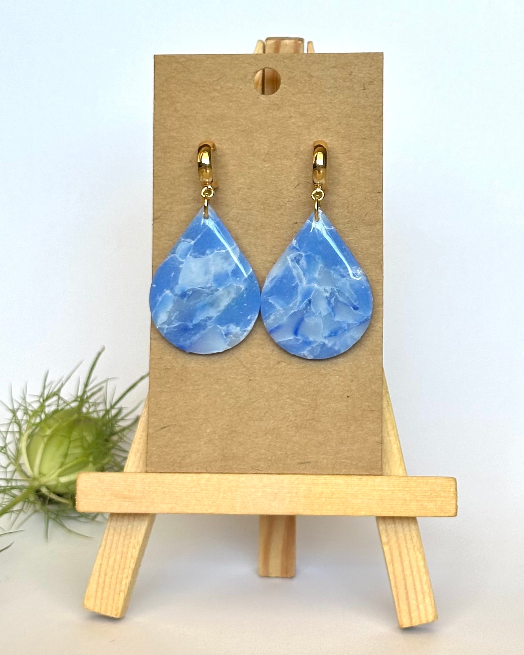 Diese eleganten Ohrhänger überzeugen durch ihre einzigartige Marmor-Optik in Hellblau- und Weisstönen, die jedes Teil zum Unikat machen. Vor allem im Sonnenlicht kommt der leicht durchsichtige Effekt besonders zur Geltung.