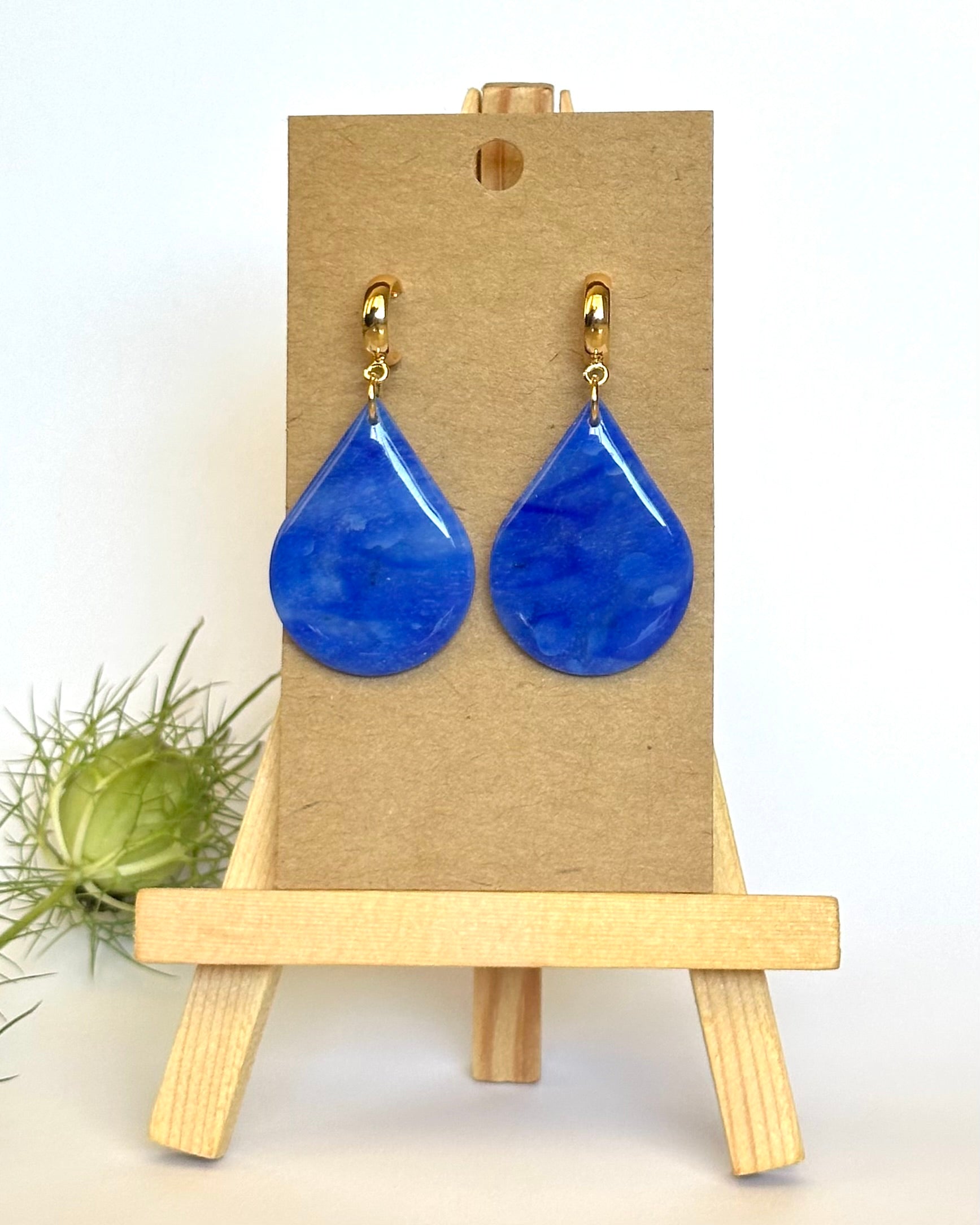 Diese eleganten Ohrhänger überzeugen durch ihre einzigartige Marmor-Optik in Blau- und Weisstönen, die jedes Teil zum Unikat machen. Vor allem im Sonnenlicht kommt der leicht durchsichtige Effekt besonders zur Geltung.