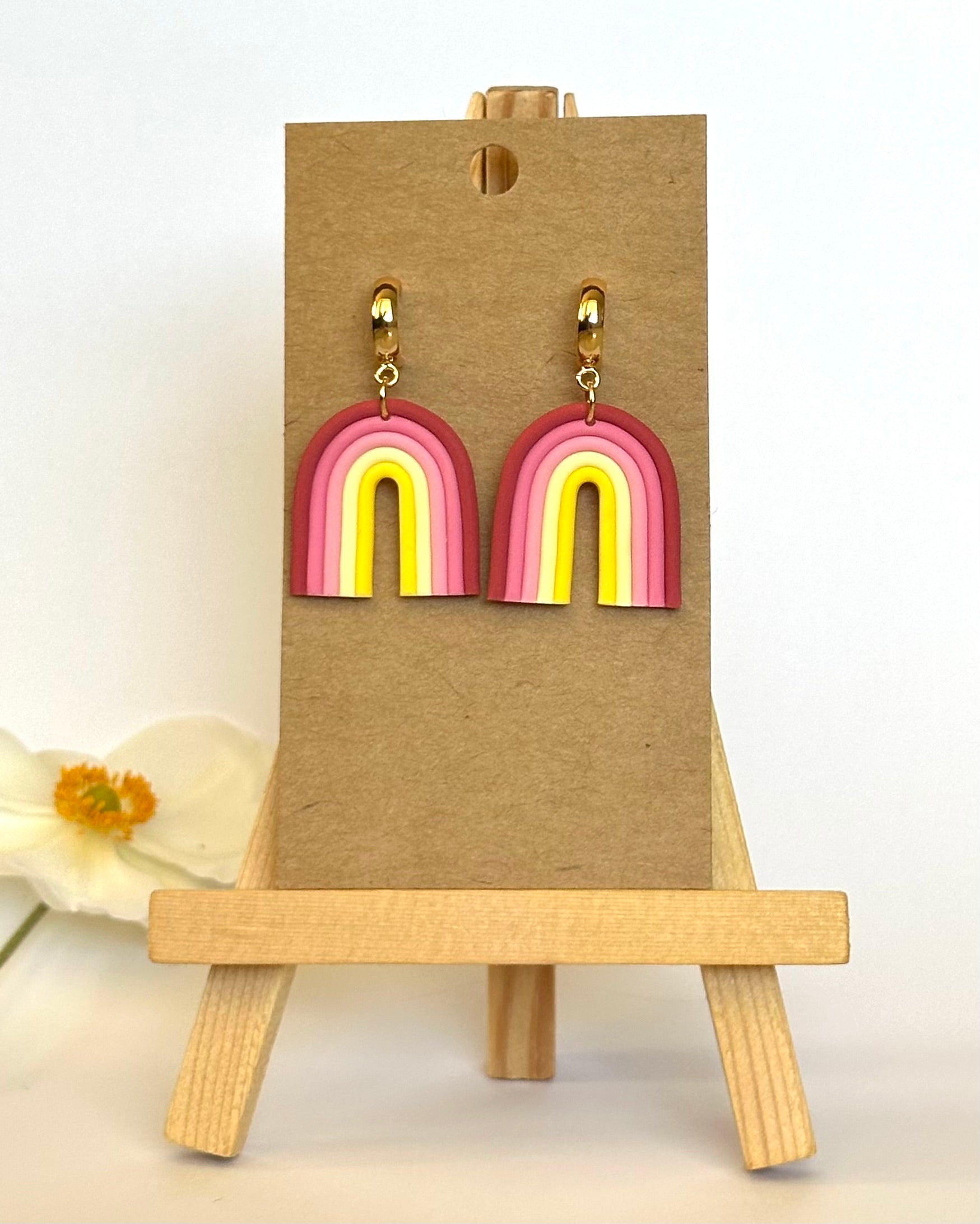 Diese süssen kleinen Regenbogen-Ohrringe aus Rot-, Rosa- und Gelbtönen sind ein absoluter Bestseller. Sie begeistern durch ihr farbenfrohes Aussehen und sind ein Hingucker an deinen Ohren. Auf Anfrage auch in silberfarben erhältlich.