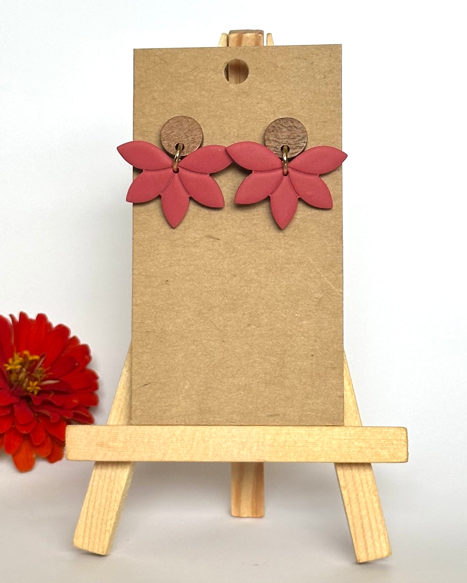 Das Besondere an diesen Ohrhängern ist die Kombination von lotusförmigem Anhänger und rundem Steckerelement aus Holz.