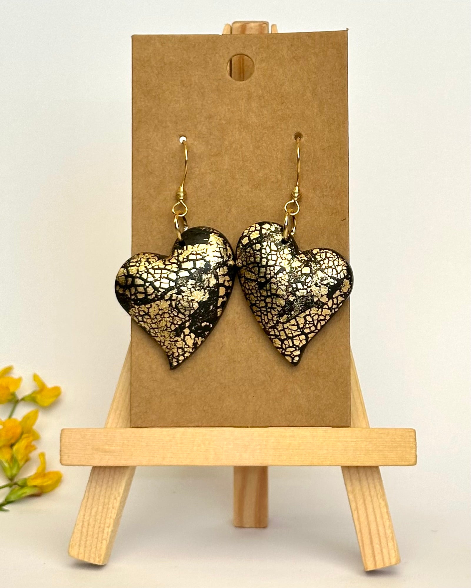 Diese edlen herzförmigen Ohrhänger sind ein Blickfang in deinem Alltag oder auf der nächsten Party. Das Besondere an ihnen sind die goldenen Akzente auf ihrer schwarzen Oberfläche, welche leicht nach oben gewölbt ist. Dadurch ergibt sich ein toller 3D-Effekt.