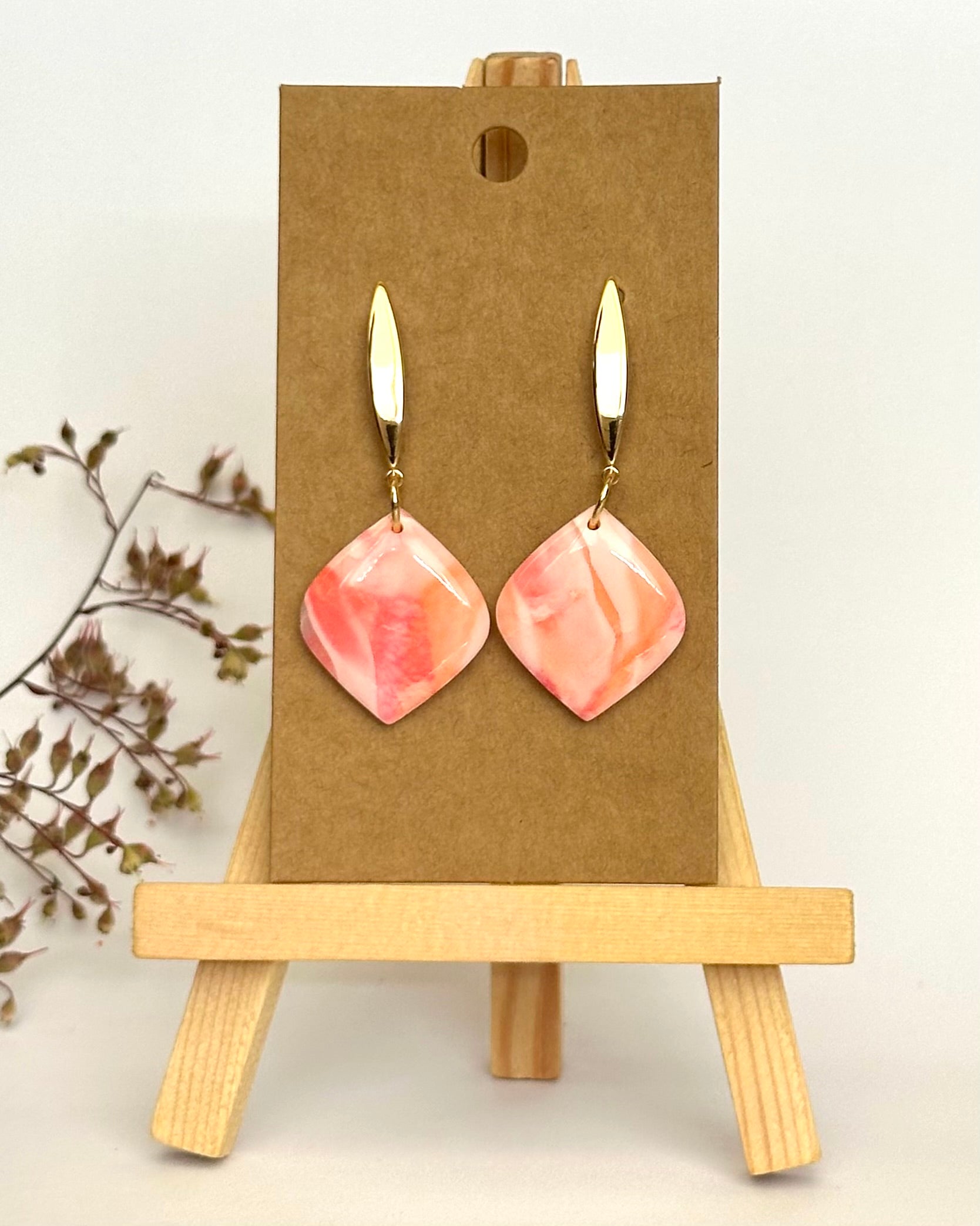 Diese eleganten Ohrhänger überzeugen durch ihre einzigartige Marmor-Optik in Rosa-, Orange- und Weisstönen, die jedes Teil zum Unikat machen. Vor allem im Sonnenlicht kommt der leicht durchsichtige Effekt besonders zur Geltung.