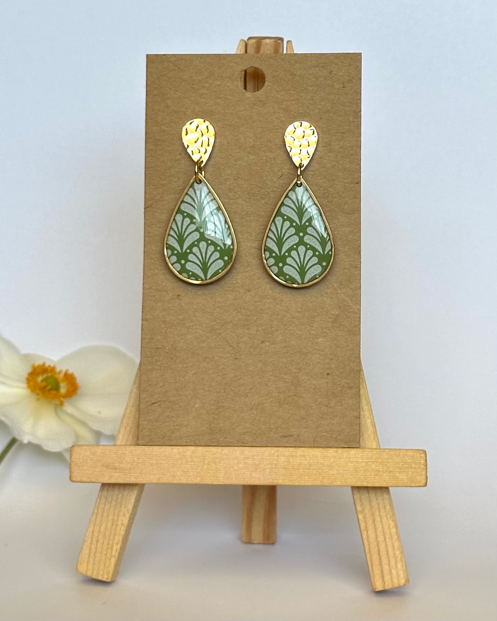 Diese stilvollen Ohrhänger sind mit einem grünen Anhänger gestaltet, der mit einem weissen Ornamentmuster verziert ist - eine Verbindung von Frische und Eleganz.