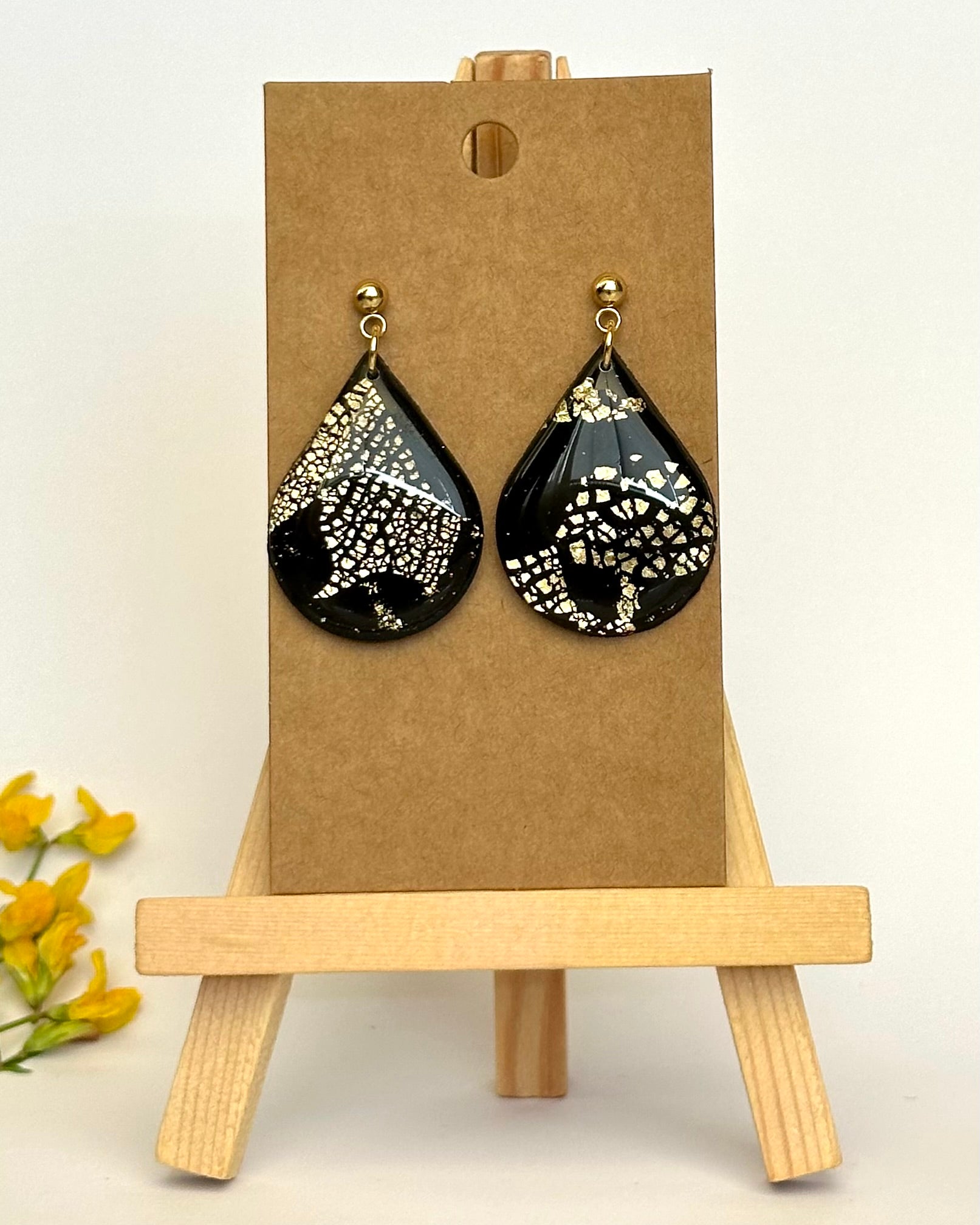 Diese edlen Ohrhänger in Tropfenform sind ein Blickfang in deinem Alltag oder auf der nächsten Party. Sie zeichnen sich durch die goldenen Akzente auf ihrer schwarzen Oberfläche aus, welche ebenfalls mit einer glänzenden Schicht aus UV-Harz überzogen ist.