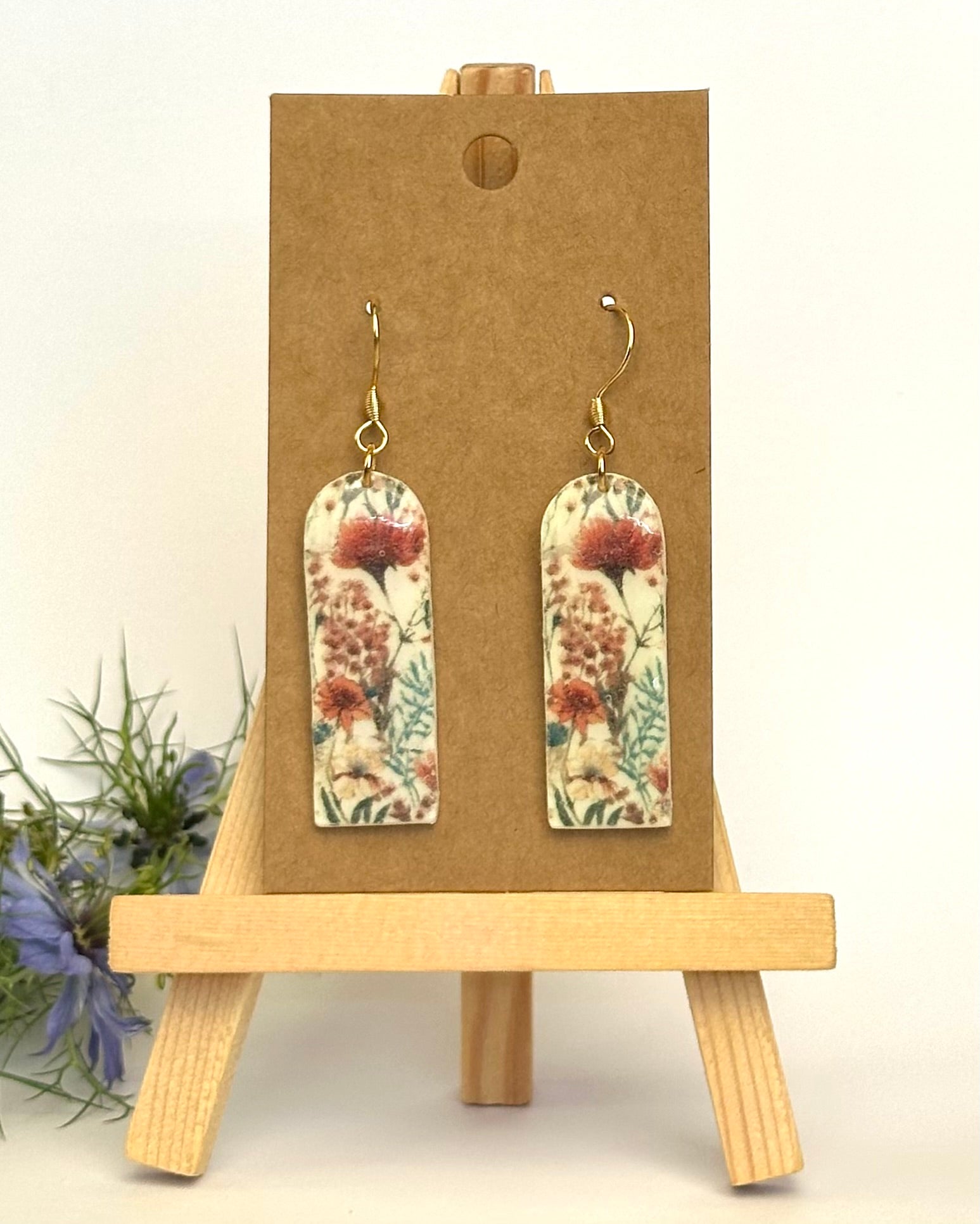 Diese Ohrhänger mit einem Blumenmotiv sind ein absoluter Hingucker. Das Motiv wurde mithilfe von Transferpapier aufgetragen und mit einer glänzenden UV-Harz-Schicht versiegelt.
