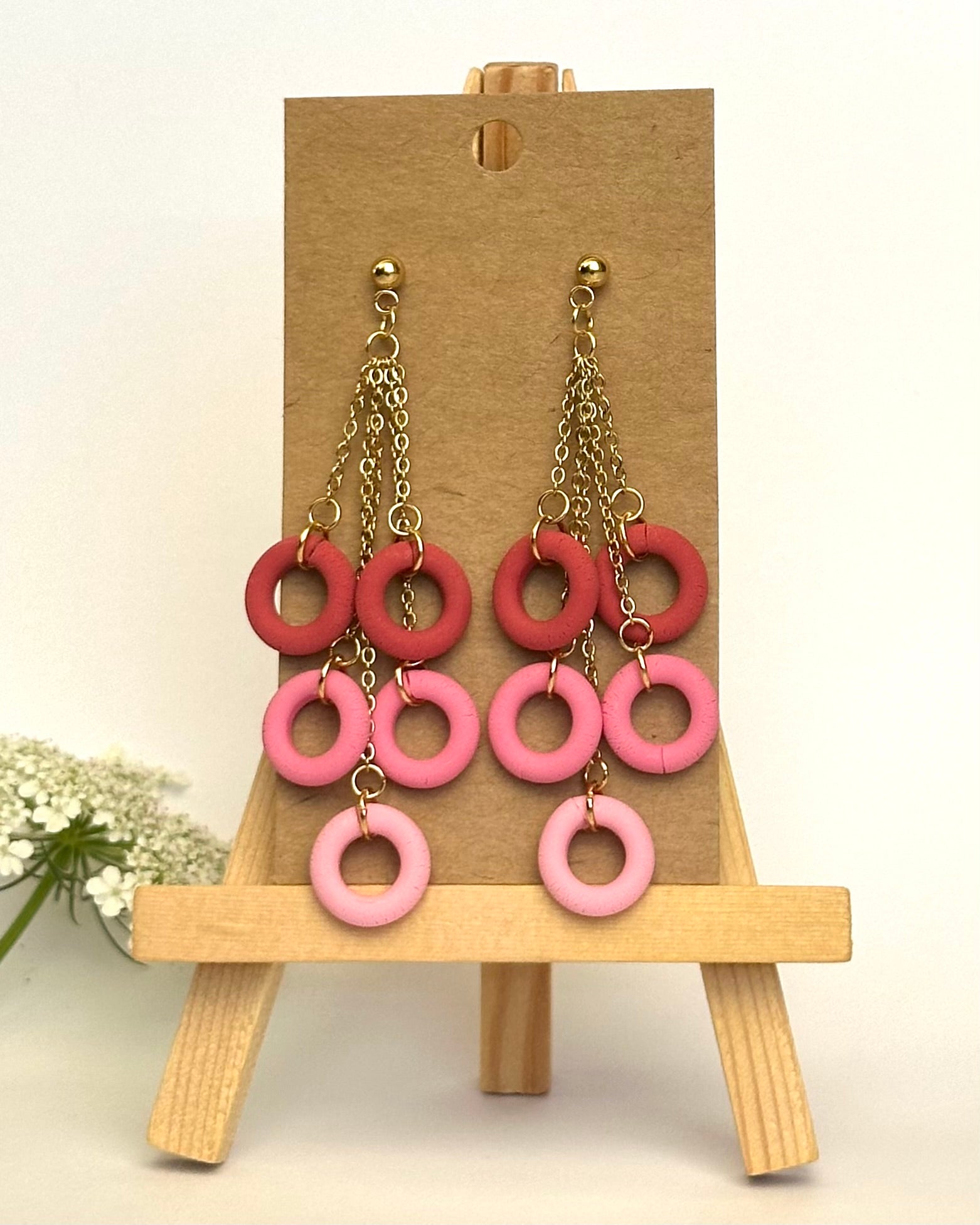 Diese eleganten Ohrringe bestehen aus jeweils fünf Ringen aus Polymerton, die aufwändig an einzelnen vergoldeten dünnen Ketten befestigt sind. Das Design besticht durch seine Extravaganz und macht sie zum perfekten Accessoire für besondere Anlässe oder den modernen Alltagslook.