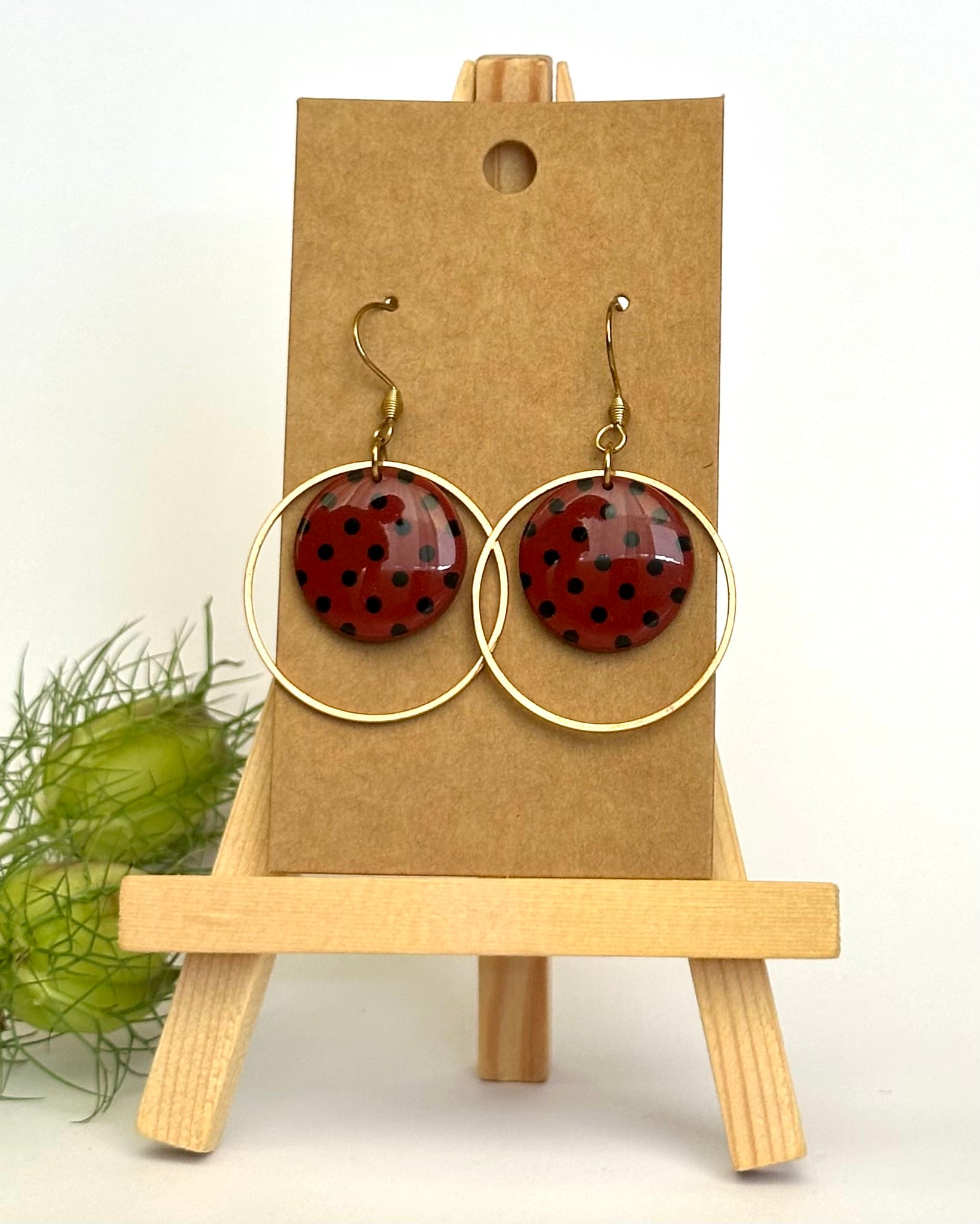 Diese runden Ohrhänger stechen durch das Polka-Dot Muster sowie das goldene Ringelement hervor und machen sie zu einem Hingucker.