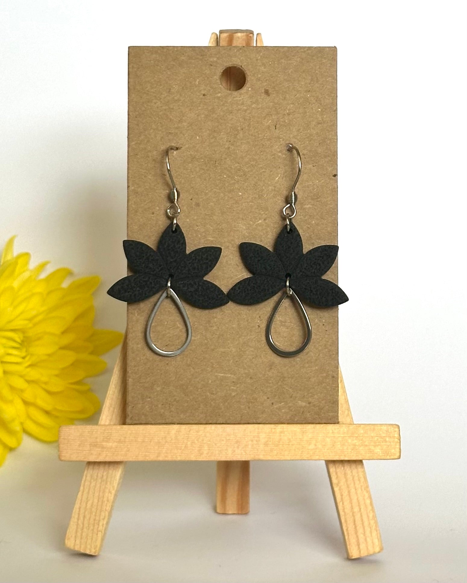 Das Besondere an diesen Ohrhängern ist die Kombination von lotusförmigem Anhänger und tropfenförmigem Edelstahlelement. Es gibt diese Ohrringe mit glattem oder gekörntem lotusförmigem Anhänger.
