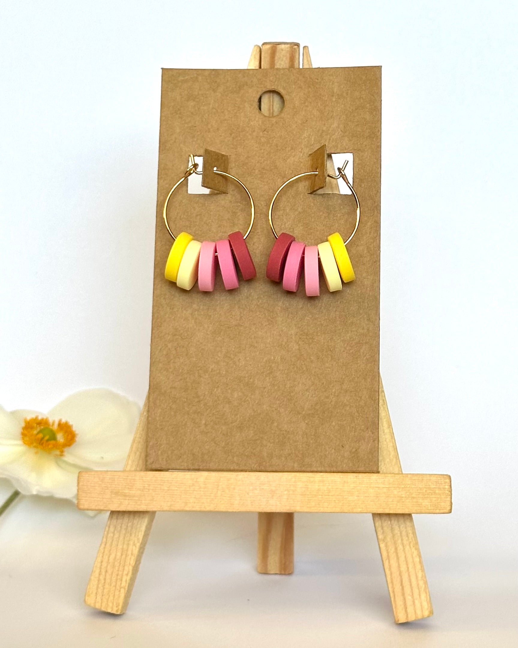 Diese süssen kleinen Regenbogen-Creolen aus Rot-, Rosa- und Gelbtönen faszinieren durch ihre Plättchenoptik und ihr farbenfrohes Aussehen. Sie sind definitiv ein Hingucker an deinen Ohren. Auf Anfrage auch in silberfarben erhältlich.