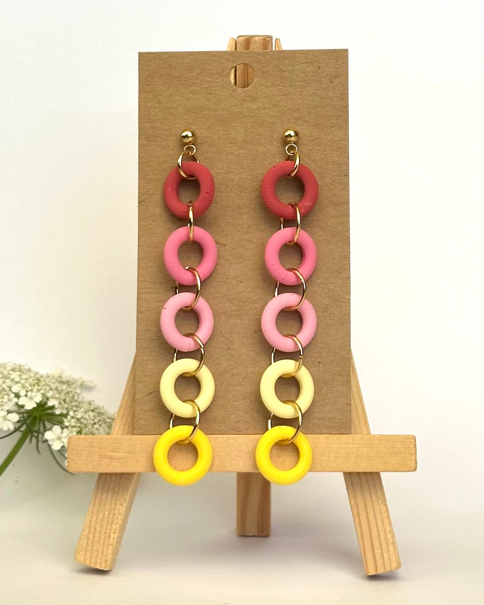 Diese süssen Regenbogen-Ohrhänger aus Rot-, Rosa- und Gelbtönen faszinieren durch ihr besonderes farbenfrohes Aussehen. Sie sind definitiv ein Hingucker an deinen Ohren. Auf Anfrage auch in silberfarben erhältlich.