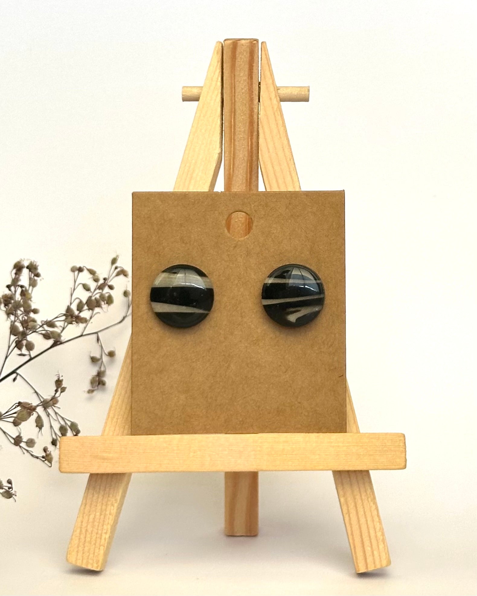 Diese eleganten Ohrstecker überzeugen durch ihre einzigartige Streifen-Optik in Schwarz und Gold, die jedes Teil zum Unikat macht.