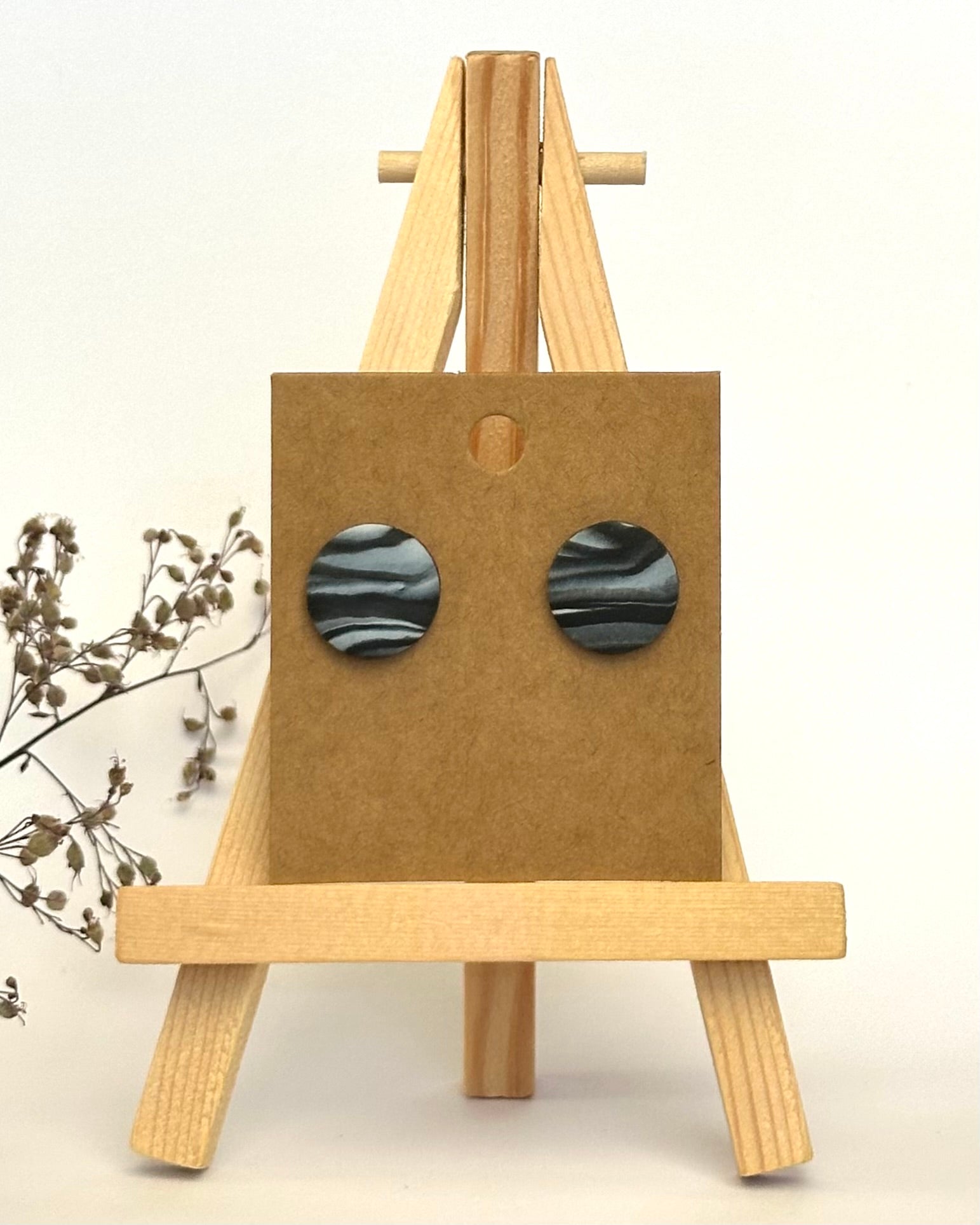 Diese runden Ohrstecker bestechen durch ihre Wellenoptik in Schwarz und Weiss. Jedes Muster ist ein Unikat. Sie passen perfekt zu jedem Outfit.