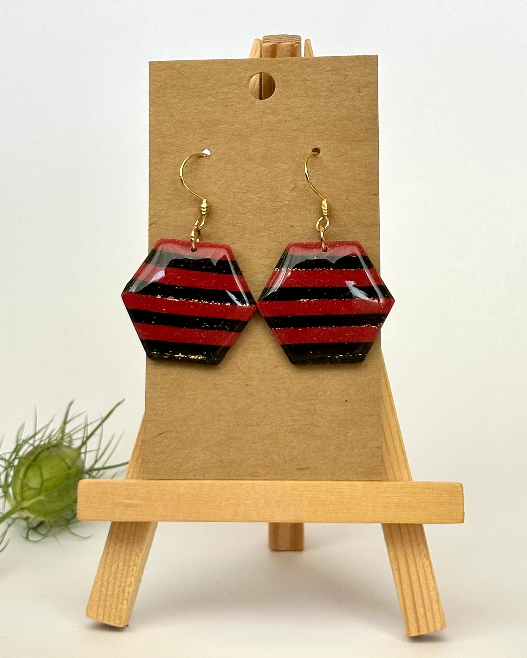Diese Ohrhänger überzeugen durch ihre einzigartigen schwarz-roten Streifen mit feinem Goldakzent. Sie sind ein Hingucker an deinen Ohren.