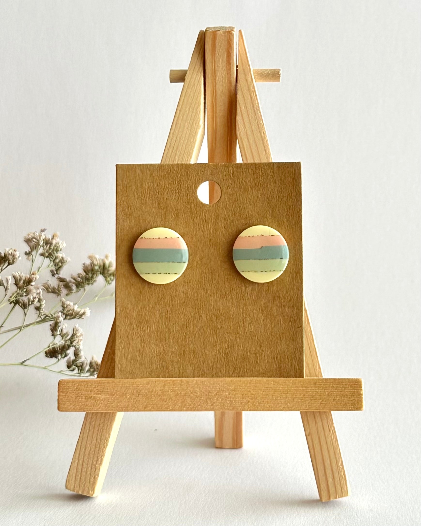 Diese runden frühlingshaften Ohrstecker zeichnen sich durch das pastellfarbene Streifenmuster in Blau-, Grün-, Gelb- und Rosatönen aus. Ein trendiges Accessoire, das jedem Outfit eine frische Note gibt.